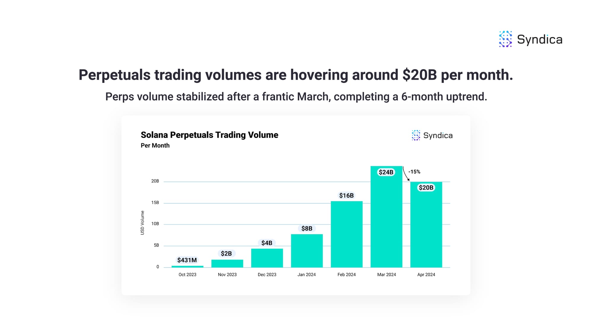 Perpetuals trading volumes are hovering around $20B per month. Perps volume stabilized after a frantic March, completing a 6-month uptrend.