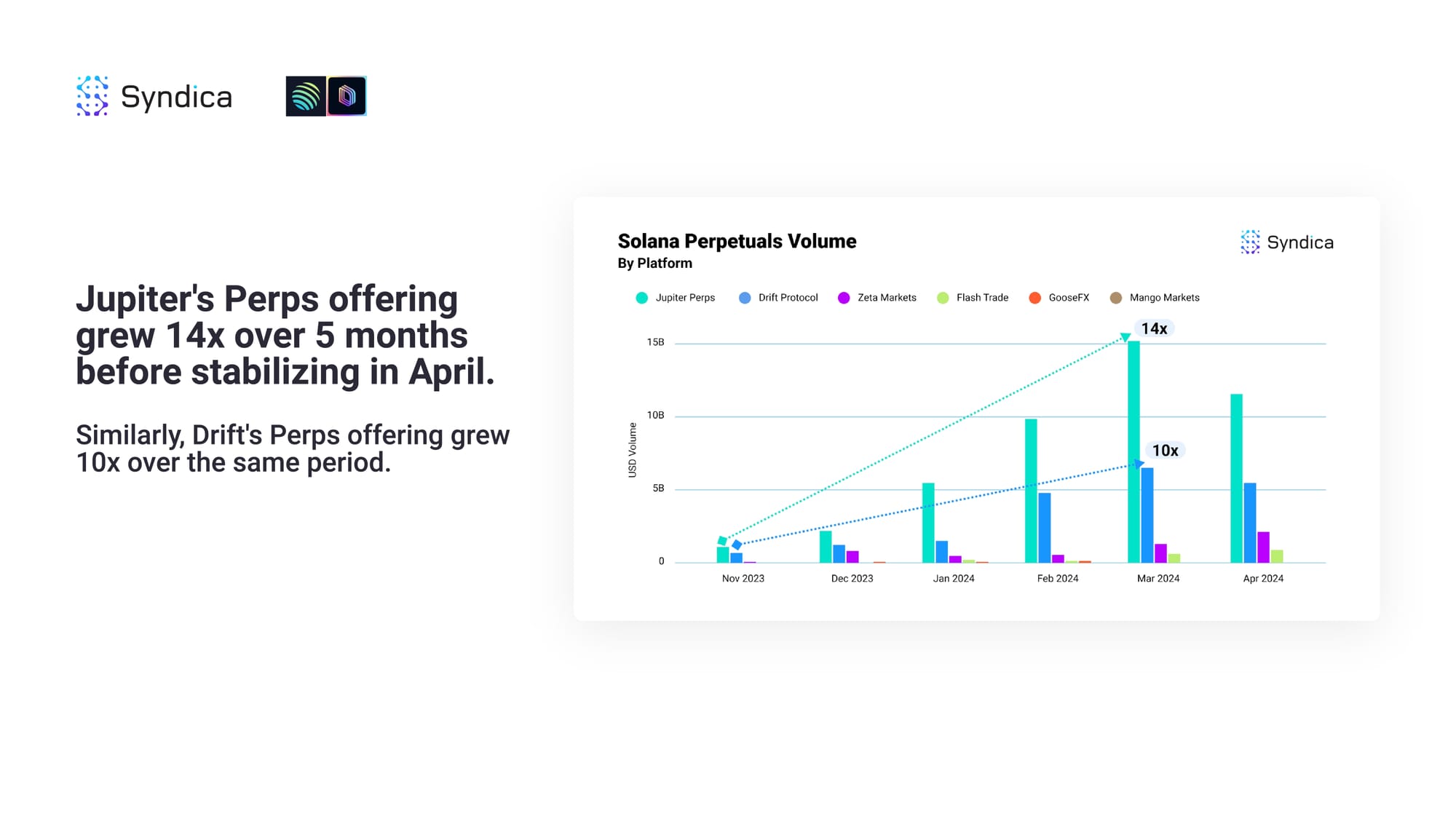 Jupiter's Perps offering grew 14x over 5 months before stabilizing in April. Similarly, Drift's Perps offering grew 10x over the same period.