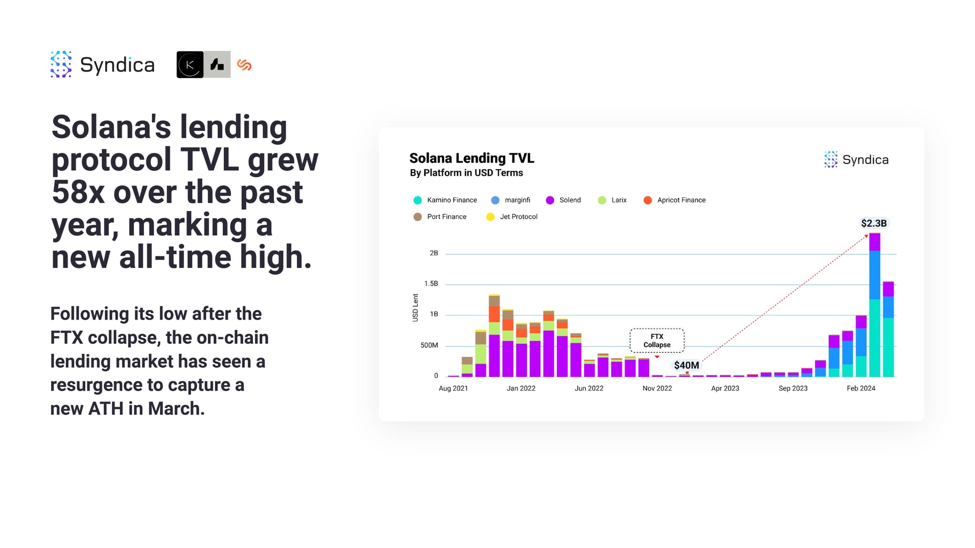 Solana's lending protocol TVL grew 58x over the past year, marking a new all-time high. Following its low after the FTX collapse, the on-chain lending market has seen a resurgence to capture a new ATH in March.