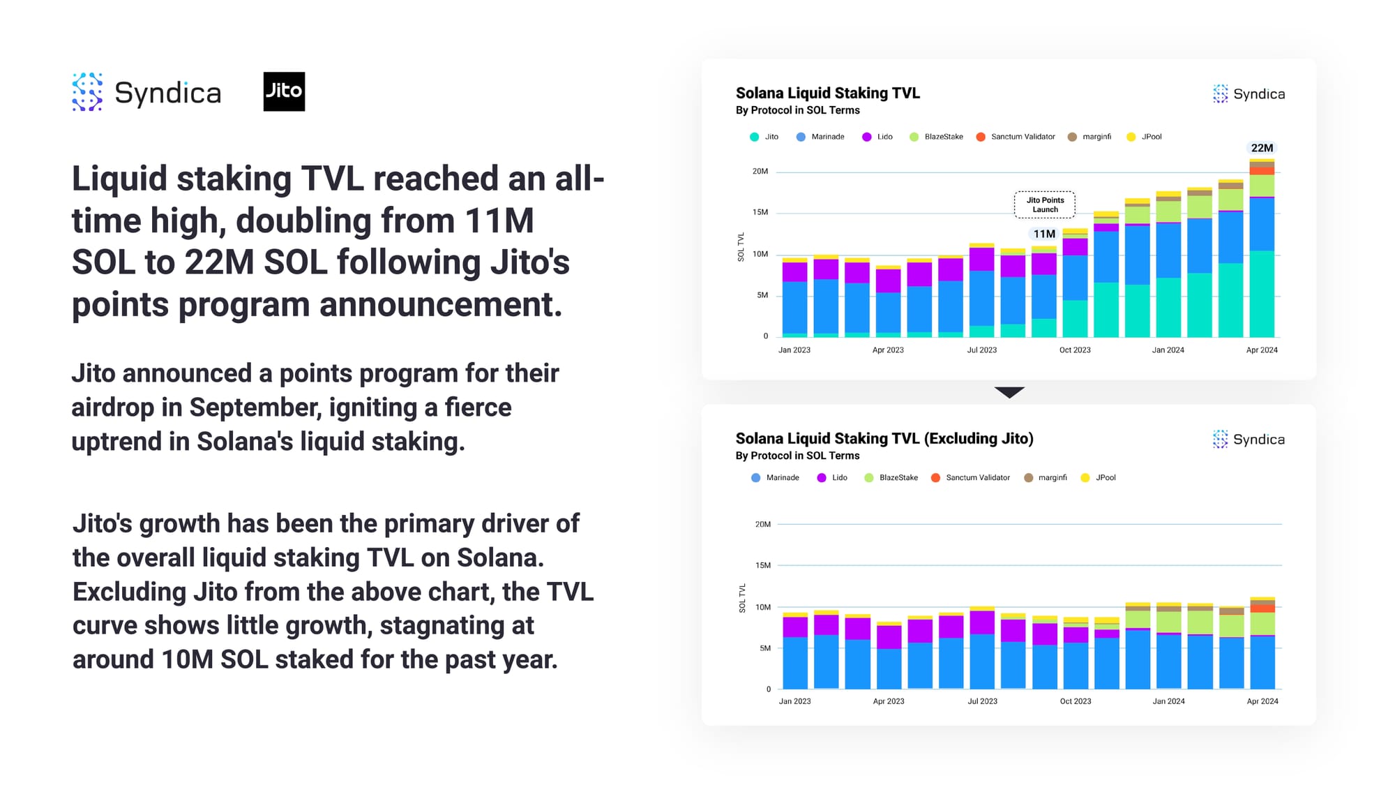 Jito's growth has been the primary driver of the overall liquid staking TVL on Solana. Excluding Jito from the above chart, the TVL curve shows little growth, stagnating at around 10M SOL staked for the past year.