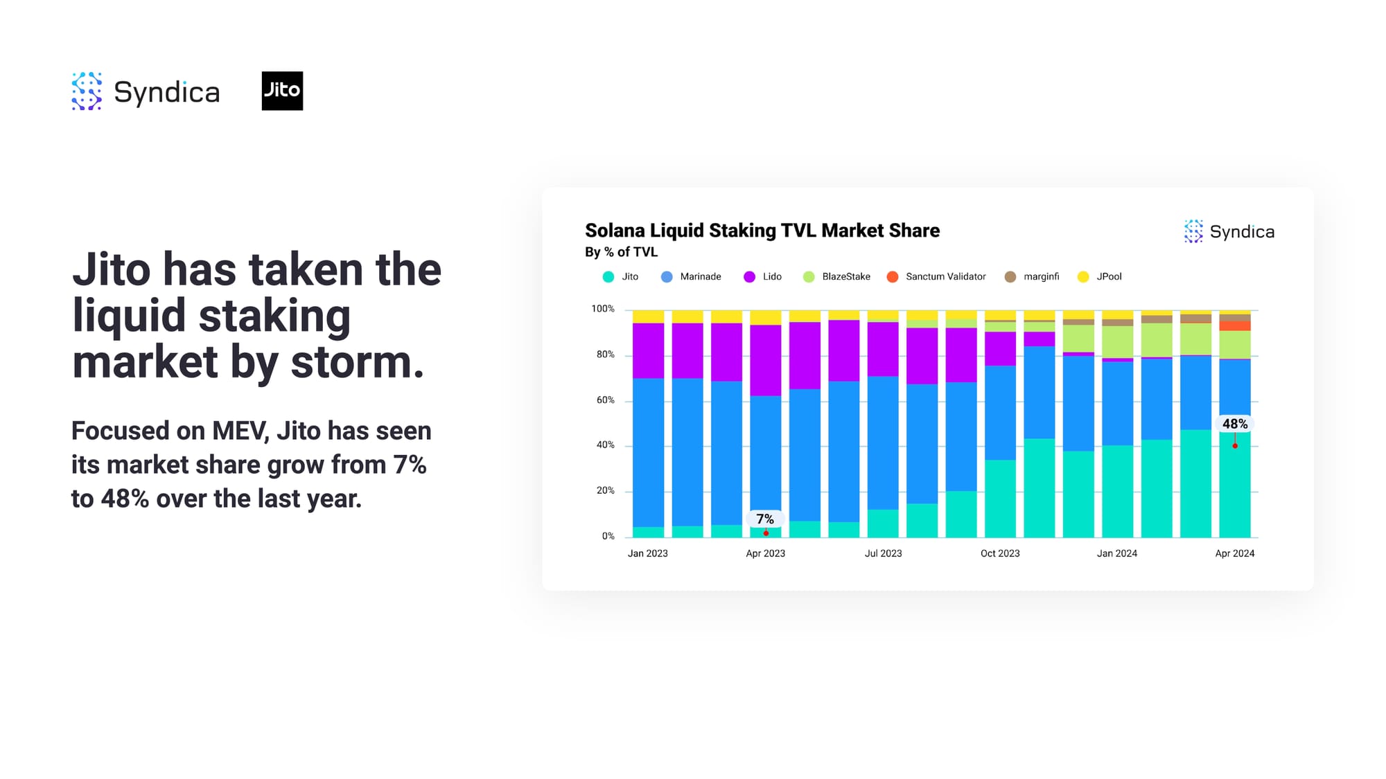 Jito has taken the liquid staking market by storm. Focused on MEV, Jito has seen its market share grow from 7% to 48% over the last year.