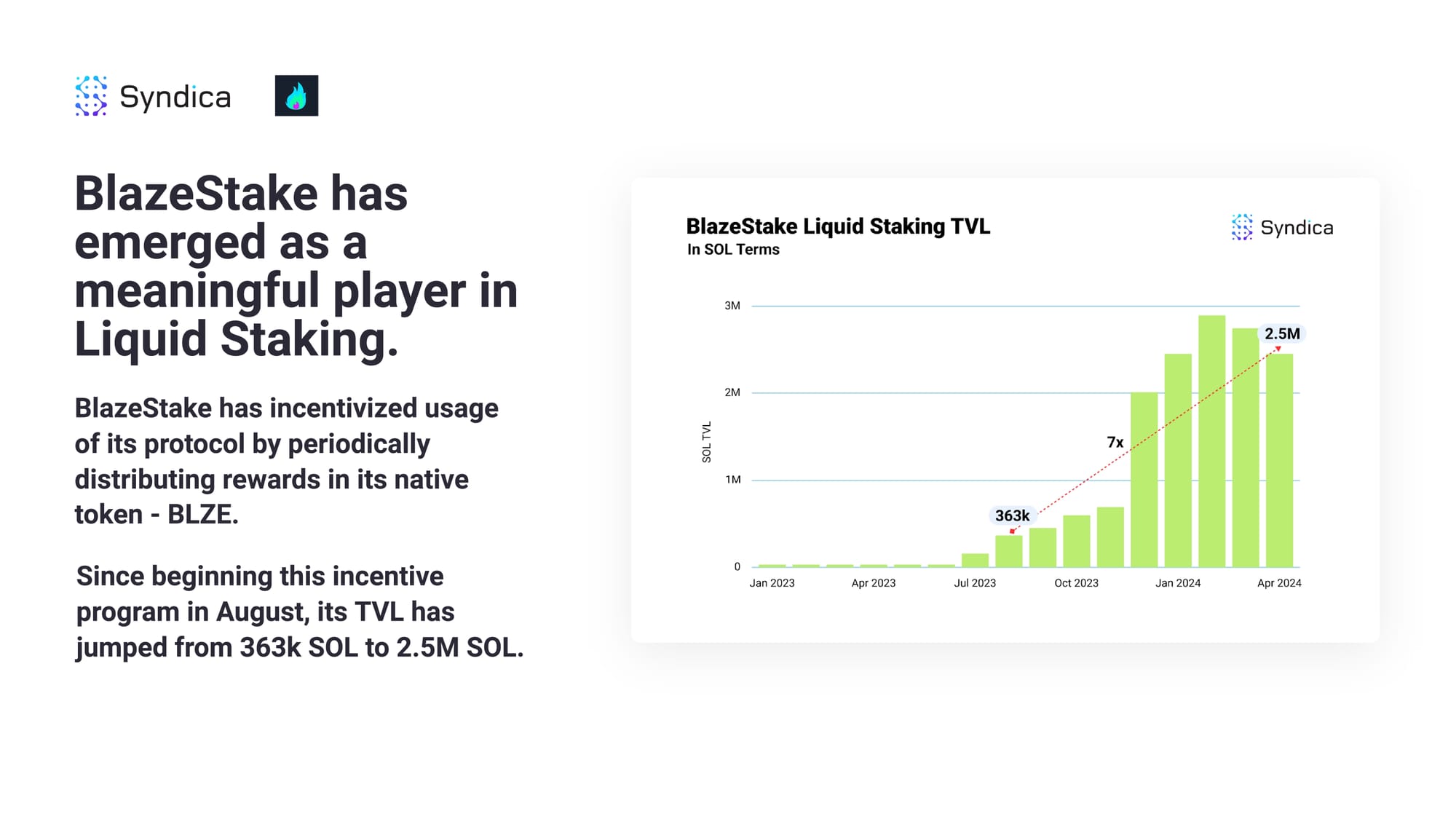 BlazeStake has emerged as a meaningful player in Liquid Staking. BlazeStake has incentivized usage of its protocol by periodically distributing rewards in its native token - BLZE. Since beginning this incentive program in August, its TVL has jumped from 363k SOL to 2.5M SOL.