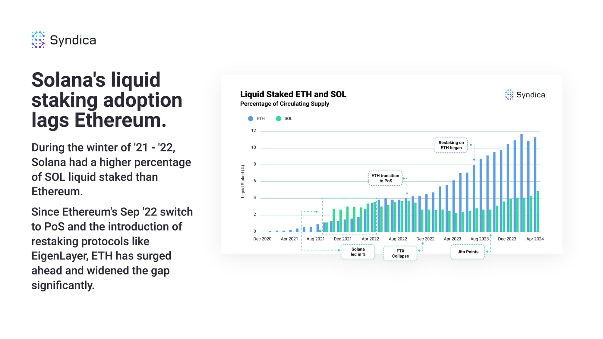 Solana's liquid staking adoption lags Ethereum. During the winter of '21 - '22, Solana had a higher percentage of SOL liquid staked than Ethereum.