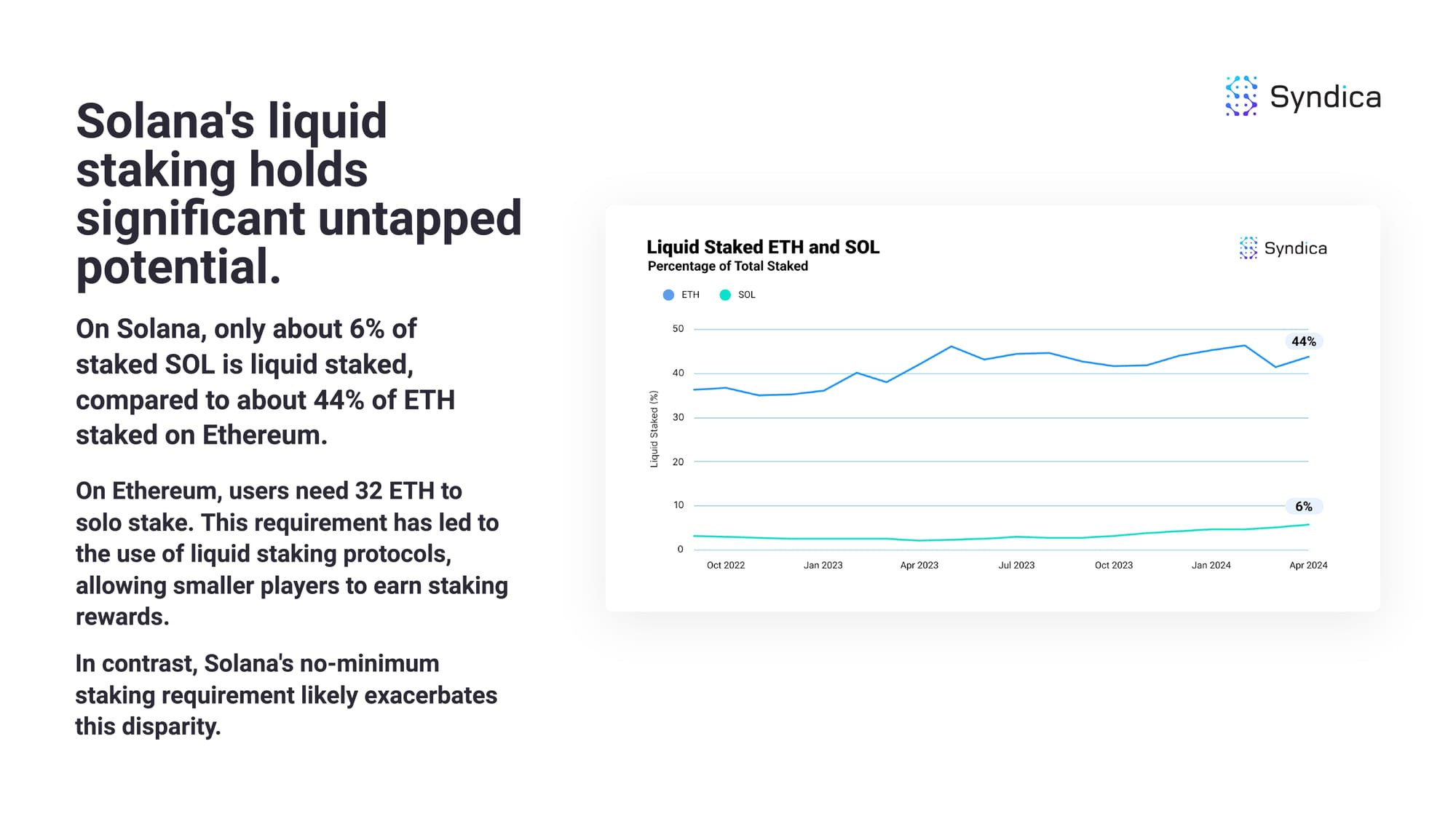 Solana's liquid staking holds significant untapped potential. On Solana, only about 6% of staked SOL is liquid staked, compared to about 44% of ETH staked on Ethereum.