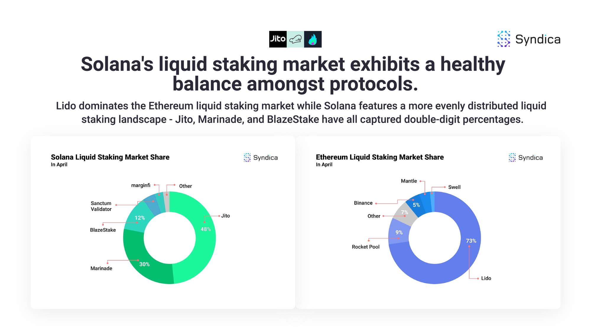 Solana's liquid staking market exhibits a healthy balance amongst protocols. Lido dominates the Ethereum liquid staking market while Solana features a more evenly distributed liquid staking landscape - Jito, Marinade, and BlazeStake have all captured double-digit percentages.