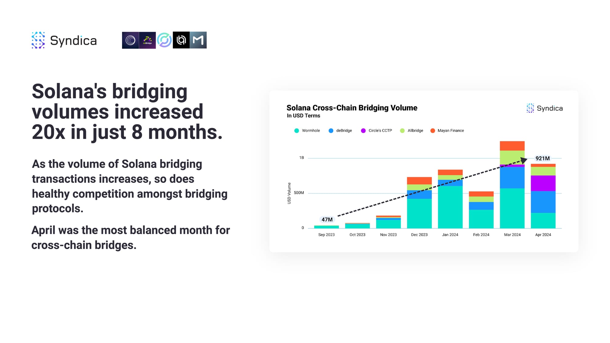 Solana's bridging volumes increased 20x in just 8 months. As the volume of Solana bridging transactions increases, so does healthy competition amongst bridging protocols. April was the most balanced month for cross-chain bridges.