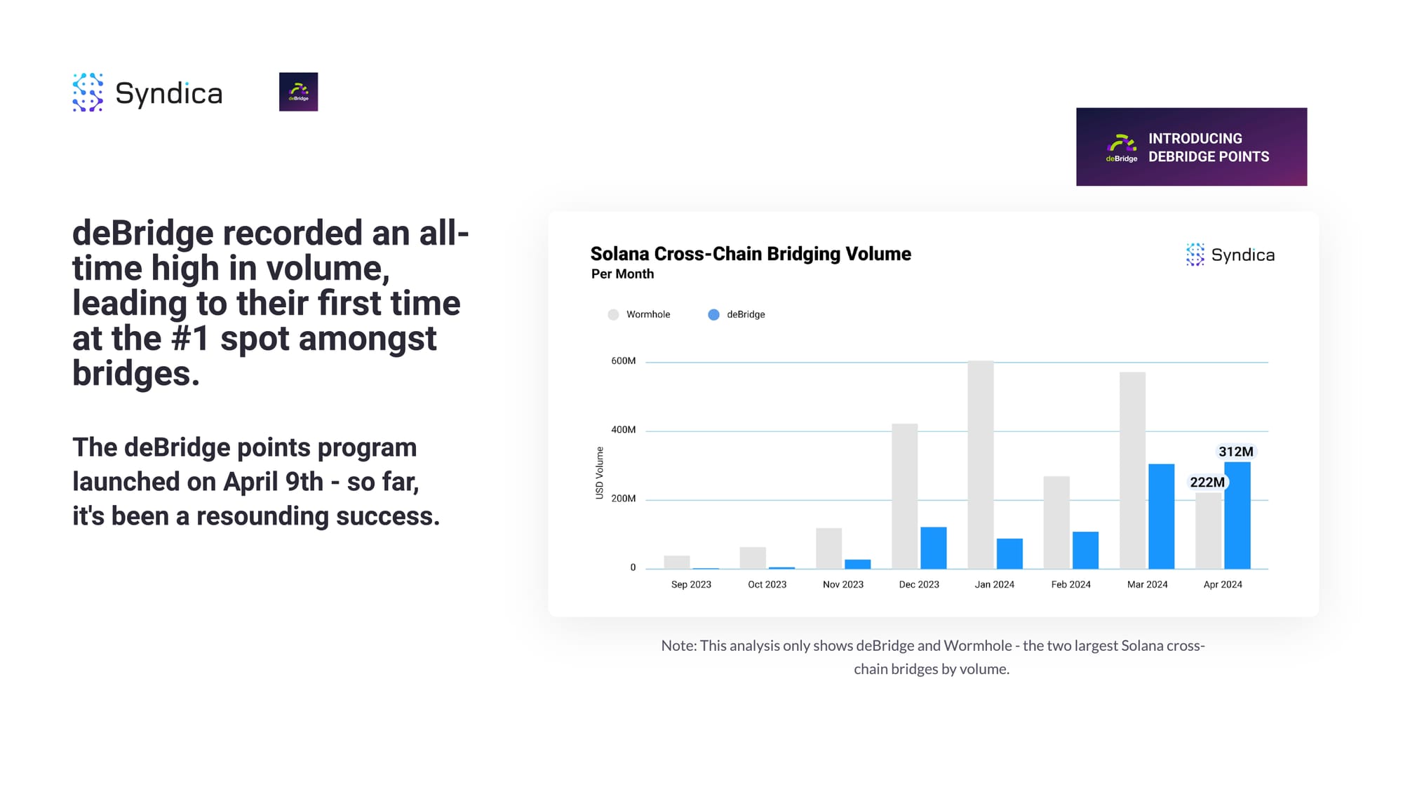 deBridge recorded an all-time high in volume, leading to their first time at the #1 spot amongst bridges. The deBridge points program launched on April 9th - so far, it's been a resounding success.