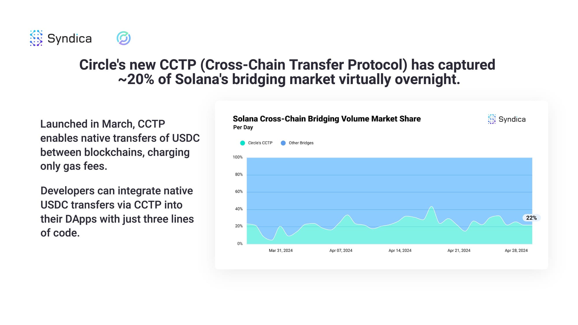 Circle's new CCTP (Cross-Chain Transfer Protocol) has captured ~20% of Solana's bridging market virtually overnight. Launched in March, CCTP enables native transfers of USDC between blockchains, charging only gas fees.