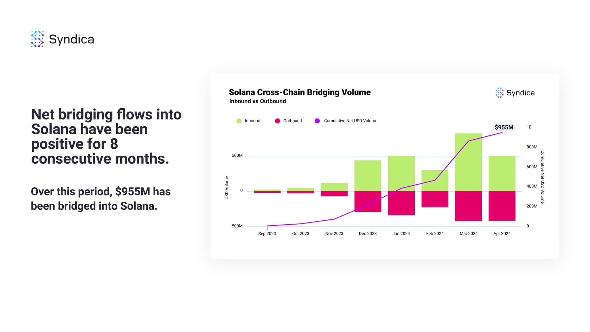 Net bridging flows into Solana have been positive for 8 consecutive months. Over this period, $955M has been bridged into Solana.