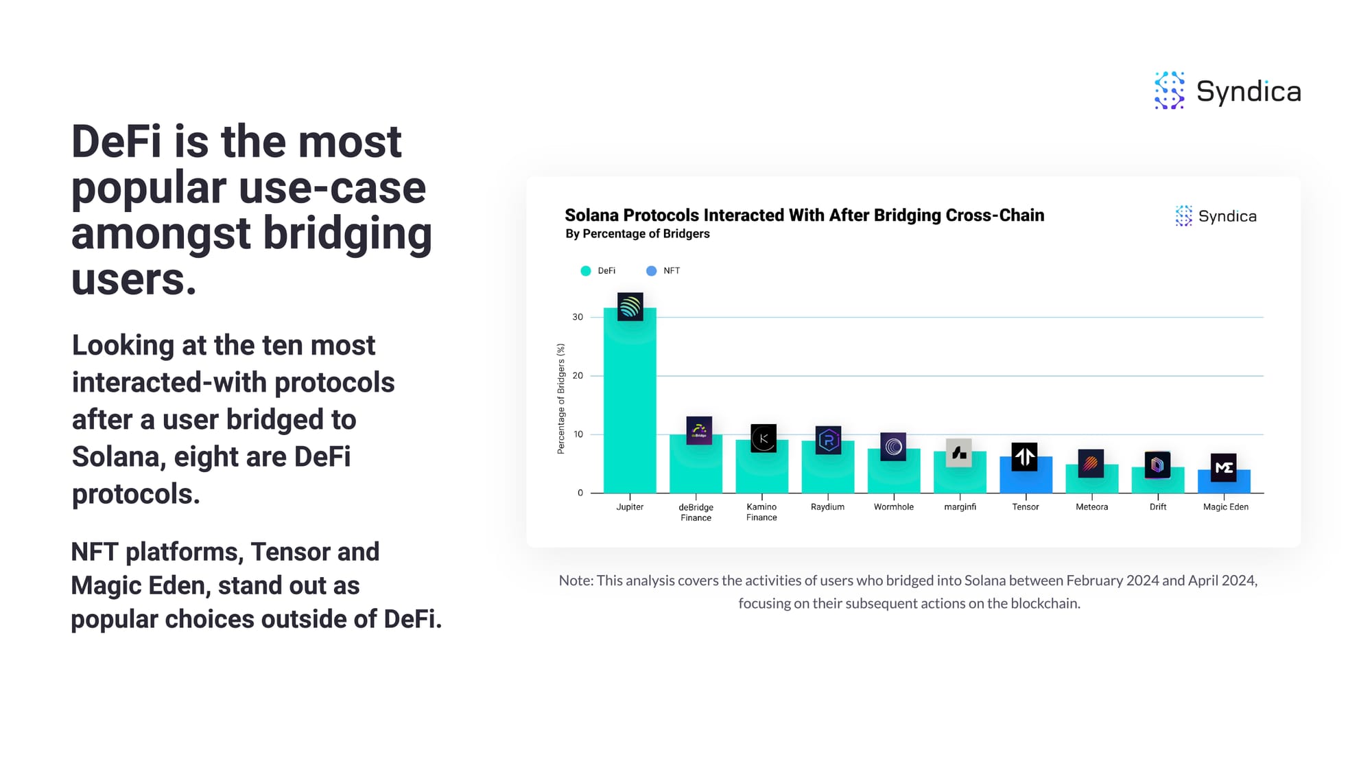 DeFi is the most popular use-case amongst bridging users. Looking at the ten most interacted-with protocols after a user bridged to Solana, eight are DeFi protocols. NFT platforms, Tensor and Magic Eden, stand out as popular choices outside of DeFi.