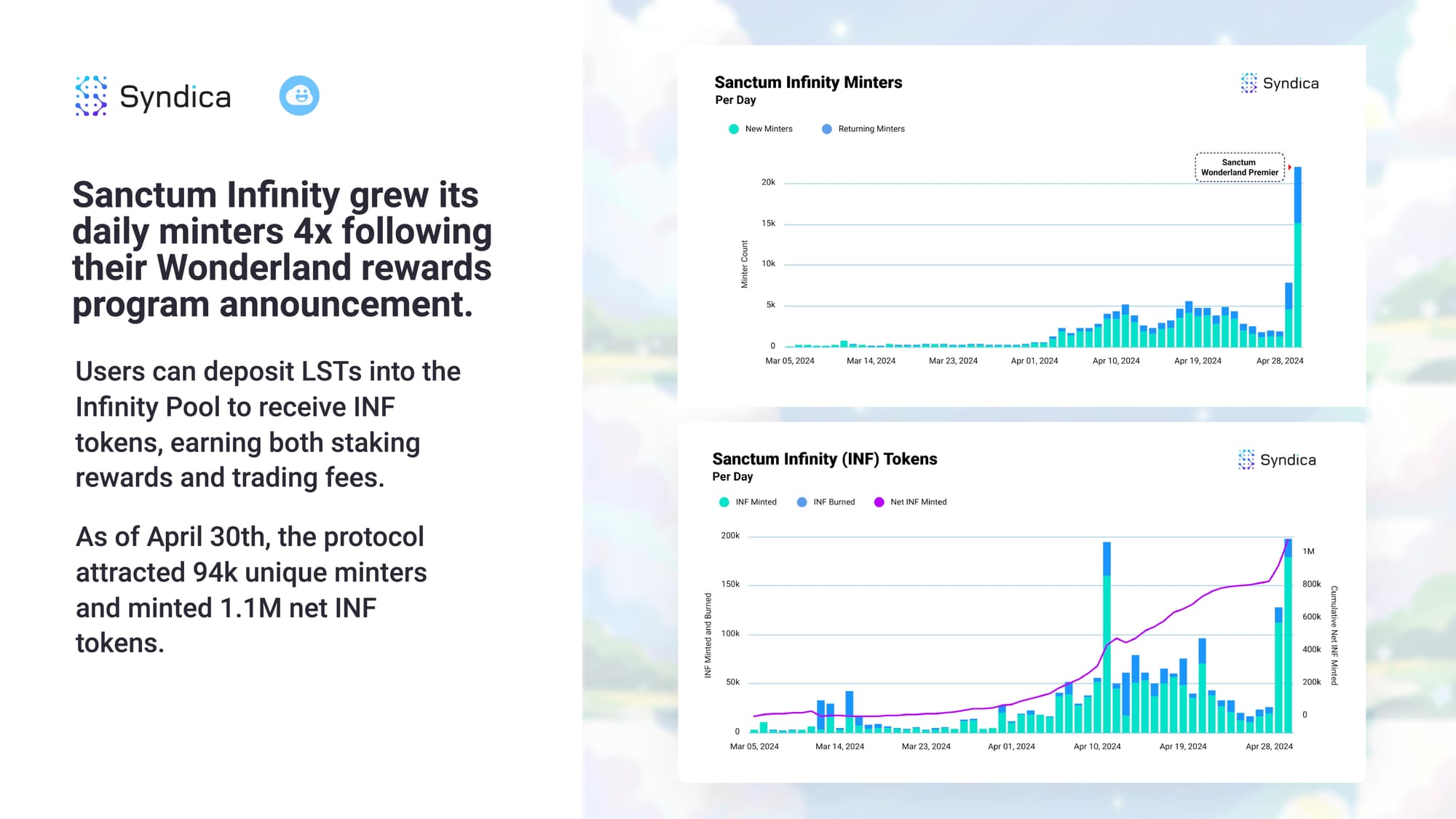 Sanctum Infinity grew its daily minters 4x following their Wonderland rewards program announcement. Users can deposit LSTs into the Infinity Pool to receive INF tokens, earning both staking rewards and trading fees. As of April 30th, the protocol attracted 94k unique minters and minted 1.1M net INF tokens.