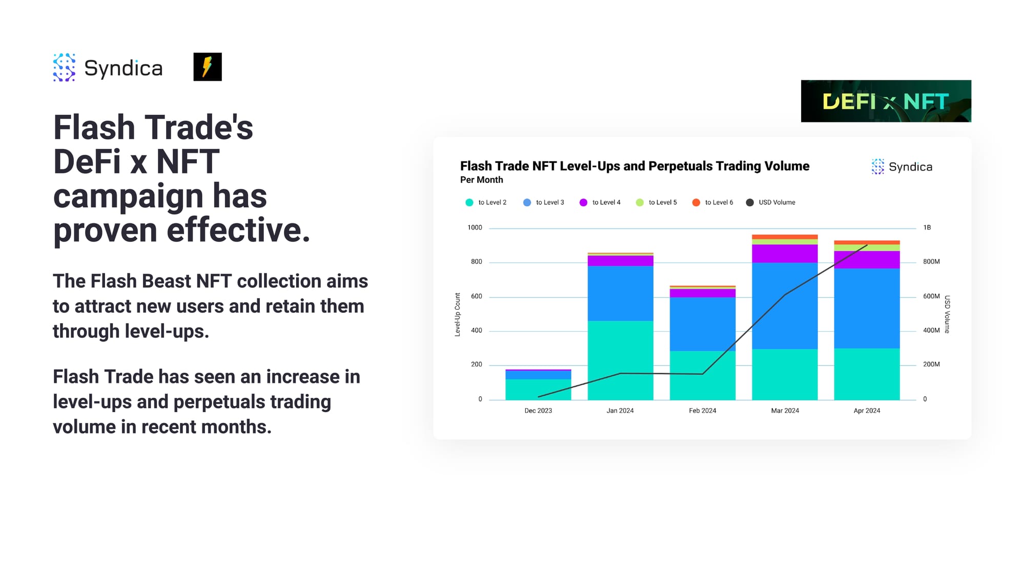 Flash Trade's DeFi x NFT campaign has proven effective. The Flash Beast NFT collection aims to attract new users and retain them through level-ups. Flash Trade has seen an increase in level-ups and perpetuals trading volume in recent months.