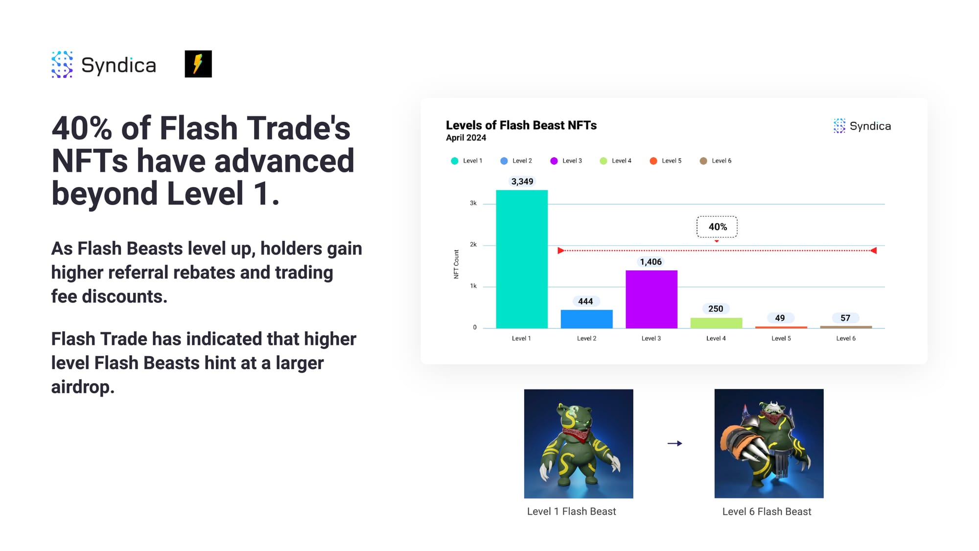 40% of Flash Trade's NFTs have advanced beyond Level 1. As Flash Beasts level up, holders gain higher referral rebates and trading fee discounts. Flash Trade has indicated that higher-level Flash Beasts hint at a larger airdrop.