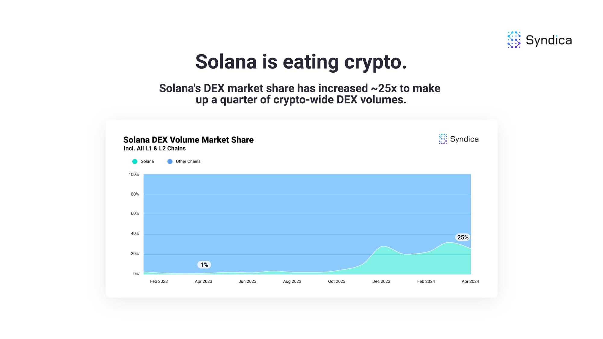 Solana is eating crypto. Solana's DEX market share has increased ~25x to make up a quarter of crypto-wide DEX volumes.