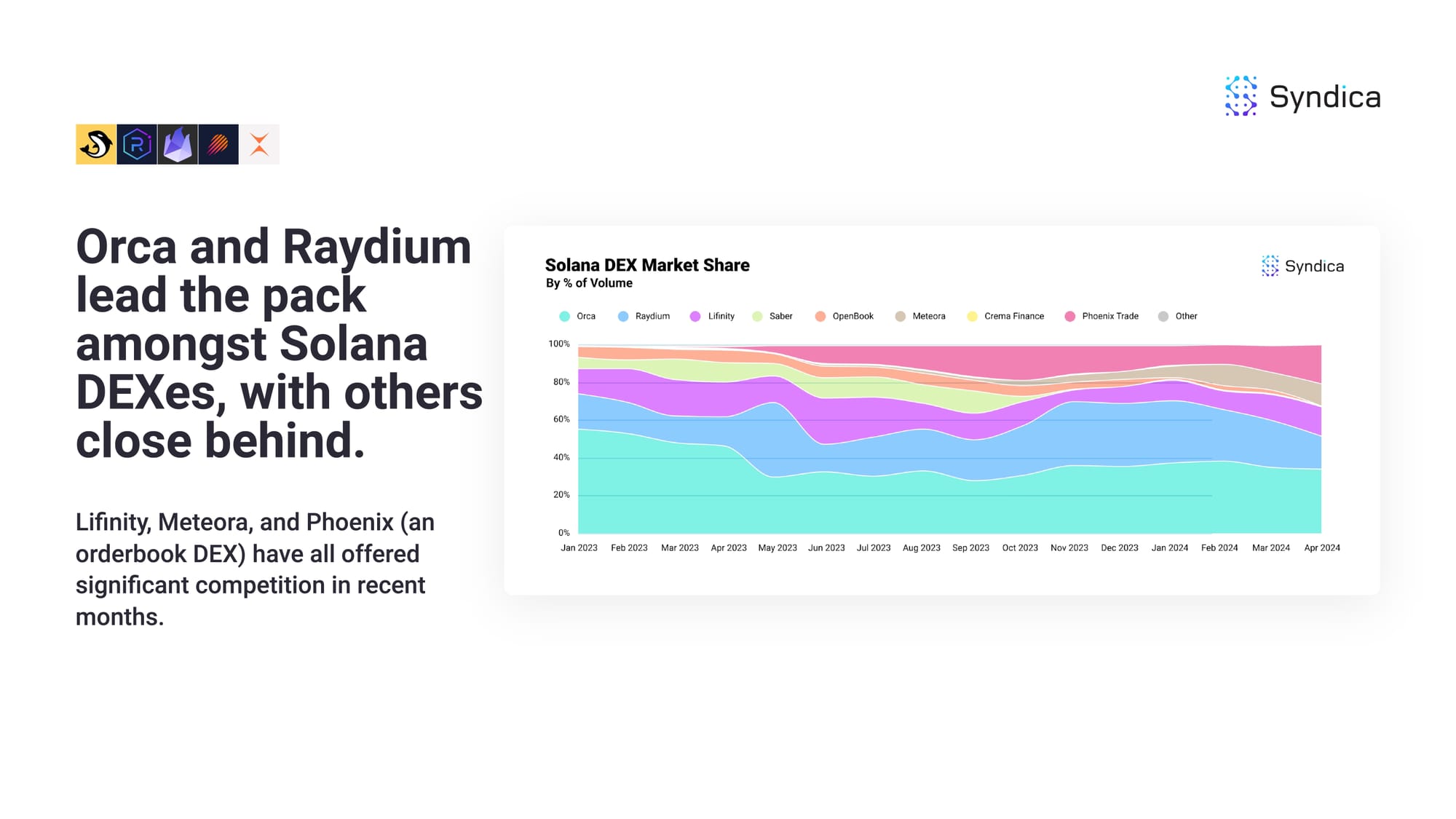 Orca and Raydium lead the pack amongst Solana DEXes, with others close behind. Lifinity, Meteora, and Phoenix (an orderbook DEX) have all offered significant competition in recent months.