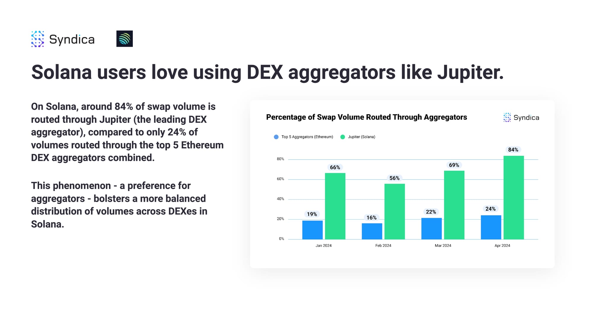 Solana users love using DEX aggregators like Jupiter. On Solana, around 84% of swap volume is routed through Jupiter (the leading DEX aggregator), compared to only 24% of volumes routed through the top 5 Ethereum DEX aggregators combined.