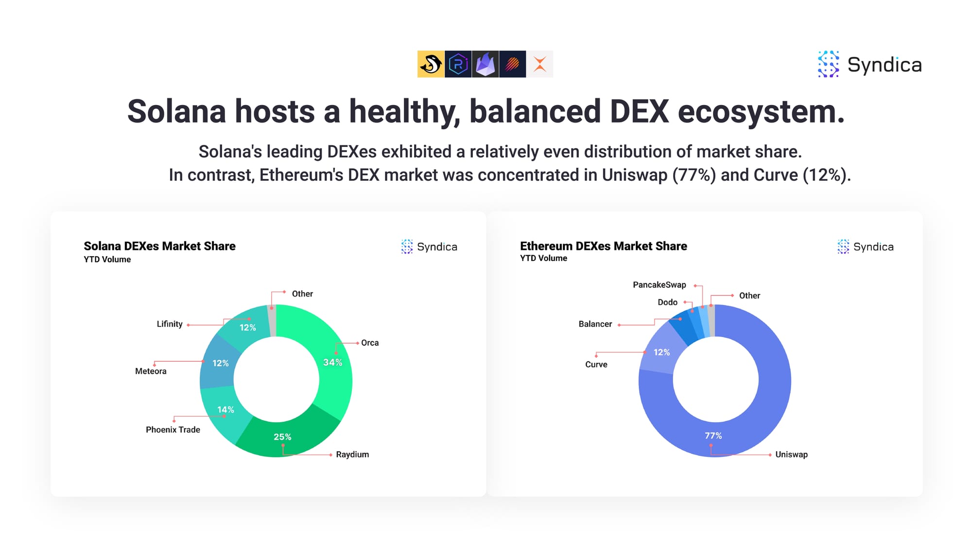 Solana hosts a healthy, balanced DEX ecosystem. Solana's leading DEXes exhibited a relatively even distribution of market share. In contrast, Ethereum's DEX market was concentrated in Uniswap (77%) and Curve (12%).