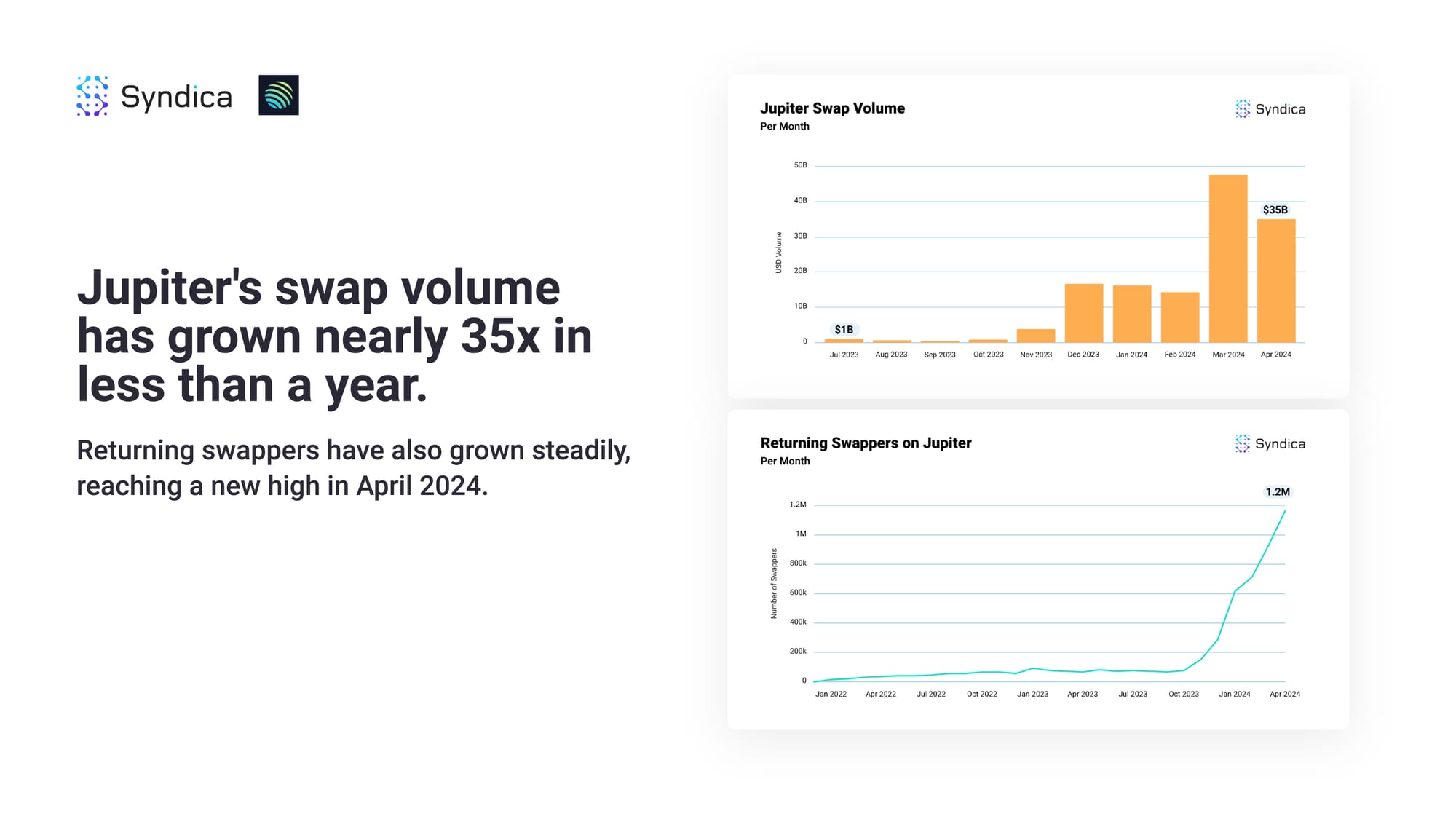Jupiter's swap volume has grown nearly 35x in less than a year. Returning swappers have also grown steadily, reaching a new high in April 2024.