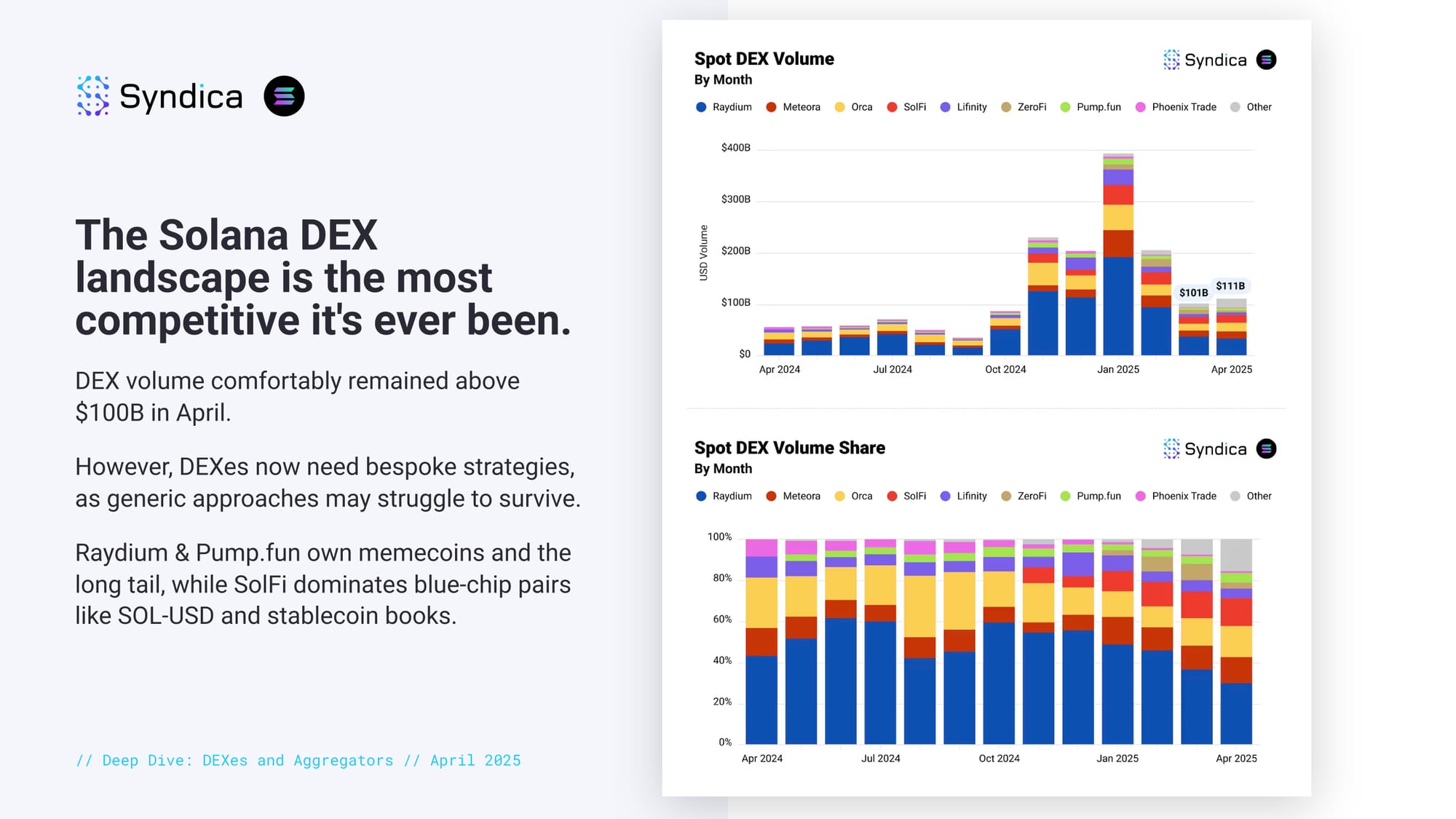 The Solana DEX landscape is the most competitive it's ever been. DEX volume comfortably remained above $100B in April. However, DEXes now need bespoke strategies, as generic approaches may struggle to survive. Raydium & Pump.fun own memecoins and the long tail, while SolFi dominates blue-chip pairs like SOL-USD and stablecoin books.