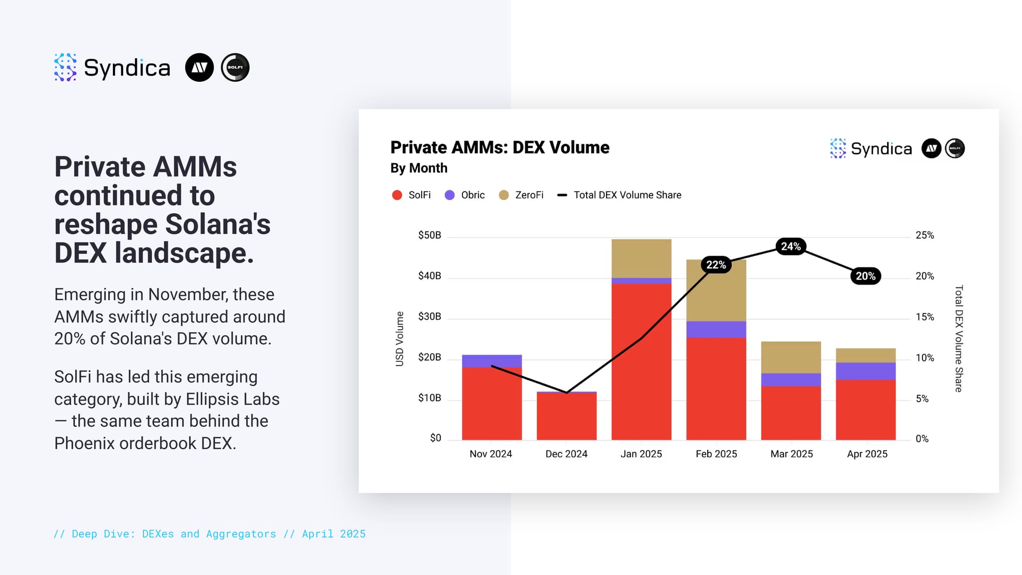 Private AMMs continued to reshape Solana's DEX landscape. Emerging in November, these AMMs swiftly captured around 20% of Solana's DEX volume. SolFi has led this emerging category, built by Ellipsis Labs — the same team behind the Phoenix orderbook DEX.