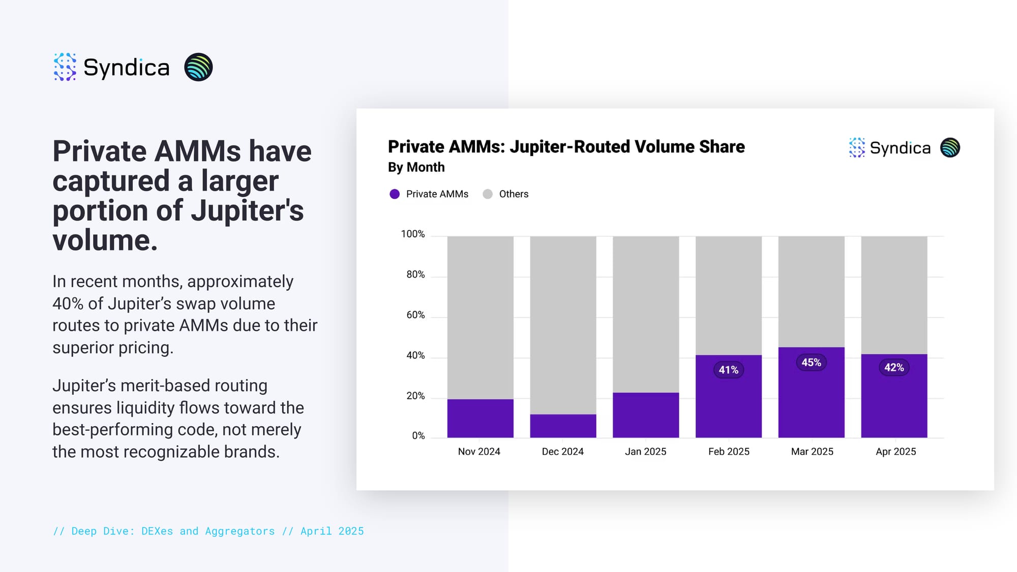 Private AMMs have captured a larger portion of Jupiter's volume. In recent months, approximately 40% of Jupiter’s swap volume routes to private AMMs due to their superior pricing. Jupiter’s merit-based routing ensures liquidity flows toward the best-performing code, not merely the most recognizable brands.