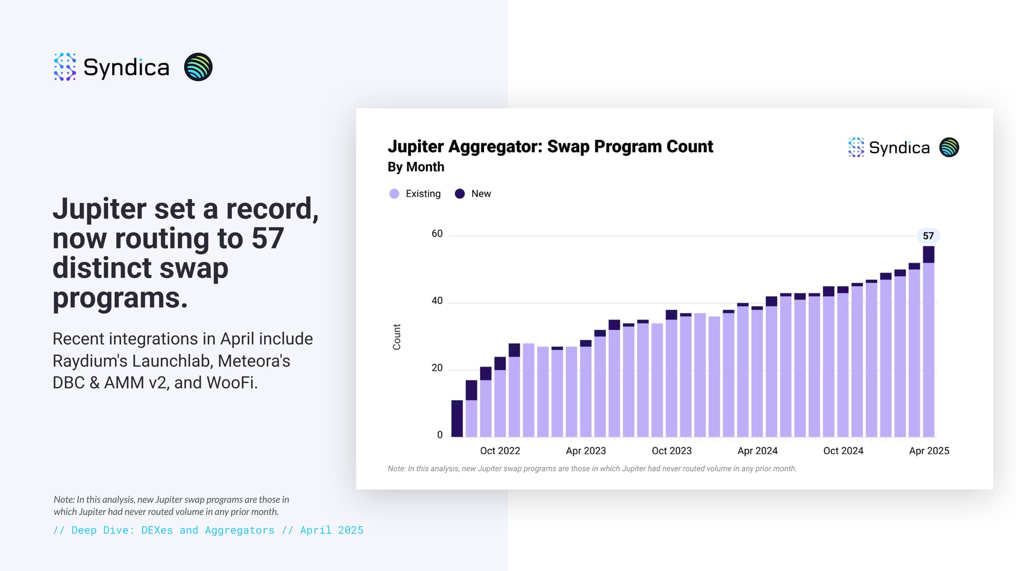 Jupiter set a record, now routing to 57 distinct swap programs. Recent integrations in April include Raydium's Launchlab, Meteora's DBC & AMM v2, and WooFi.