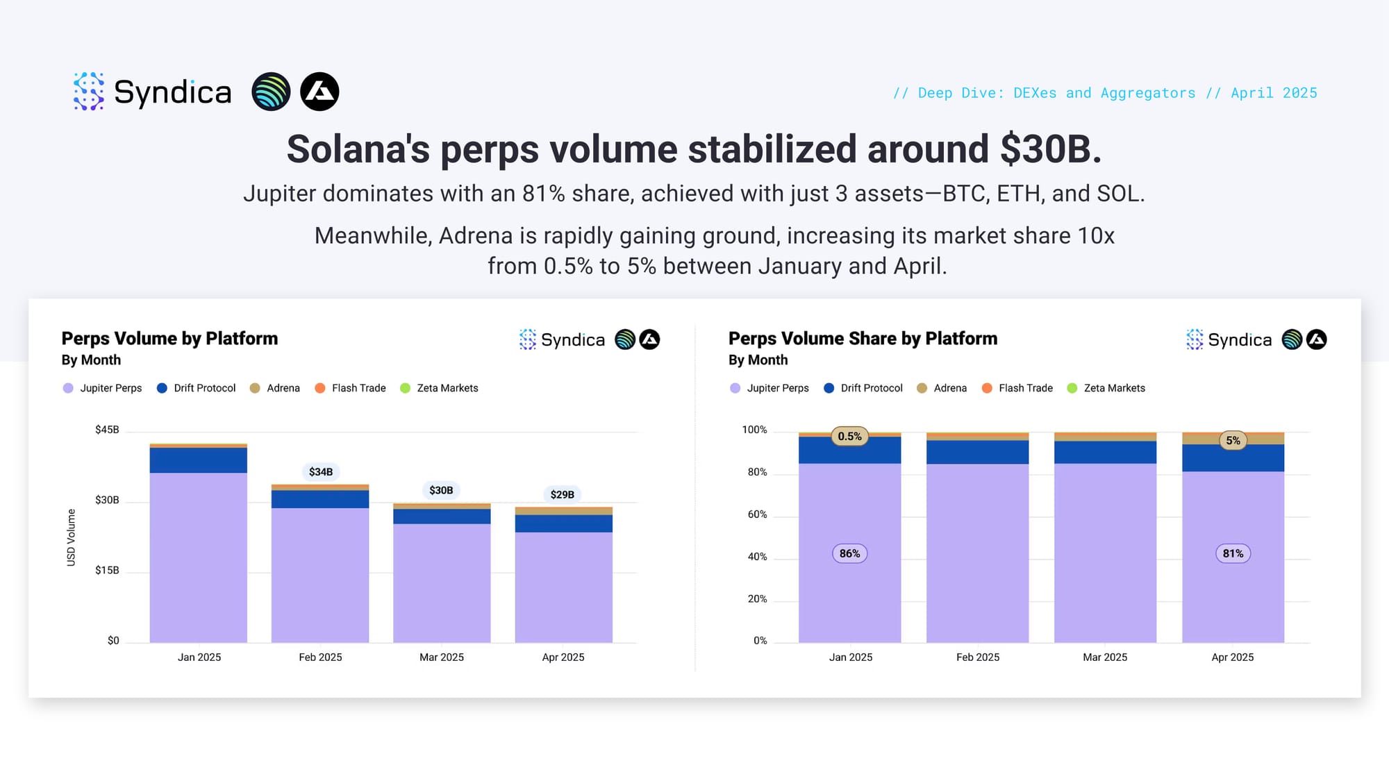Solana's perps volume stabilized around $30B. Jupiter dominates with an 81% share, achieved with just 3 assets—BTC, ETH, and SOL. Meanwhile, Adrena is rapidly gaining ground, increasing its market share 10x from 0.5% to 5% between January and April.