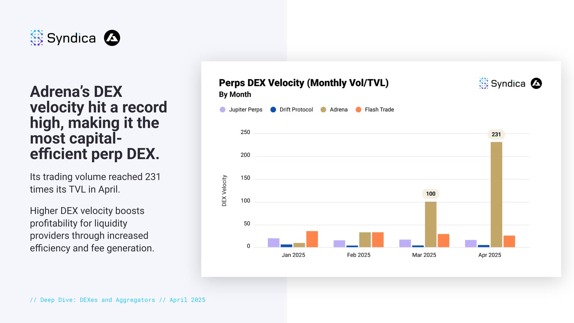 Adrena’s DEX velocity hit a record high, making it the most capital-efficient perp DEX. Its trading volume reached 231 times its TVL in April. Higher DEX velocity boosts profitability for liquidity providers through increased efficiency and fee generation.