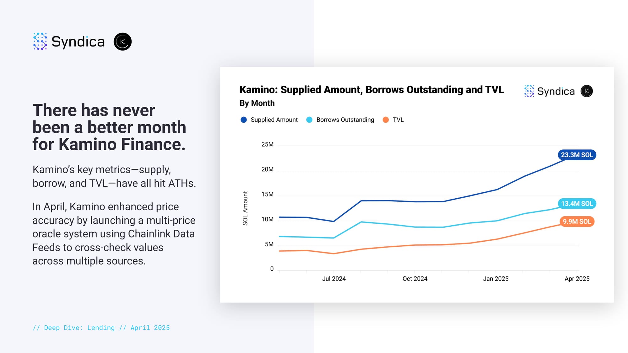 There has never been a better month for Kamino Finance. Kamino’s key metrics—supply, borrow, and TVL—have all hit ATHs. In April, Kamino enhanced price accuracy by launching a multi-price oracle system using Chainlink Data Feeds to cross-check values across multiple sources.