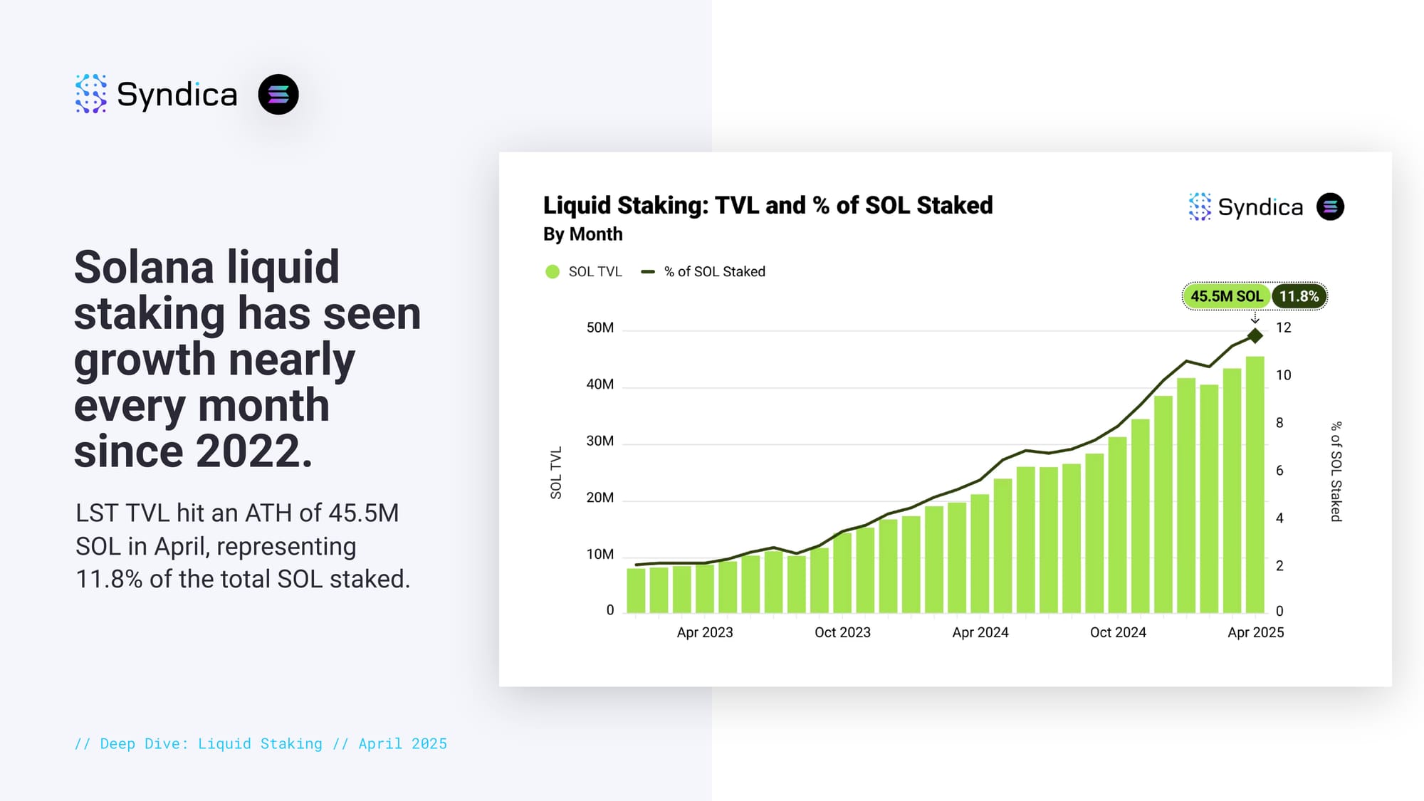 Solana liquid staking has seen growth nearly every month since 2022. LST TVL hit an ATH of 45.5M SOL in April, representing 11.8% of the total SOL staked.