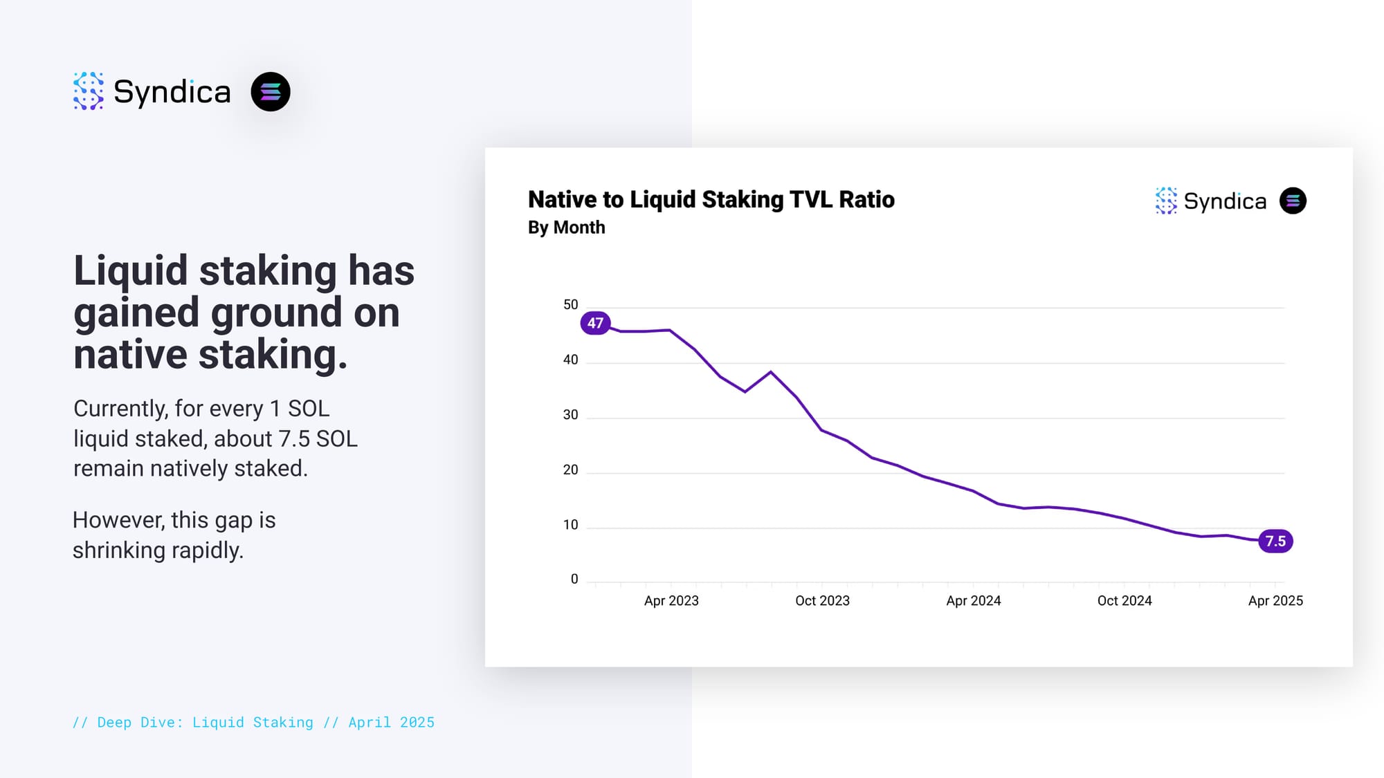 Liquid staking has gained ground on native staking. Currently, for every 1 SOL liquid staked, about 7.5 SOL remain natively staked. However, this gap is shrinking rapidly.
