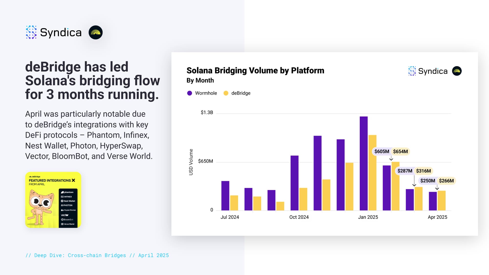 deBridge has led Solana's bridging flow for 3 months running. April was particularly notable due to deBridge’s integrations with key DeFi protocols – Phantom, Infinex, Nest Wallet, Photon, HyperSwap, Vector, BloomBot, and Verse World.