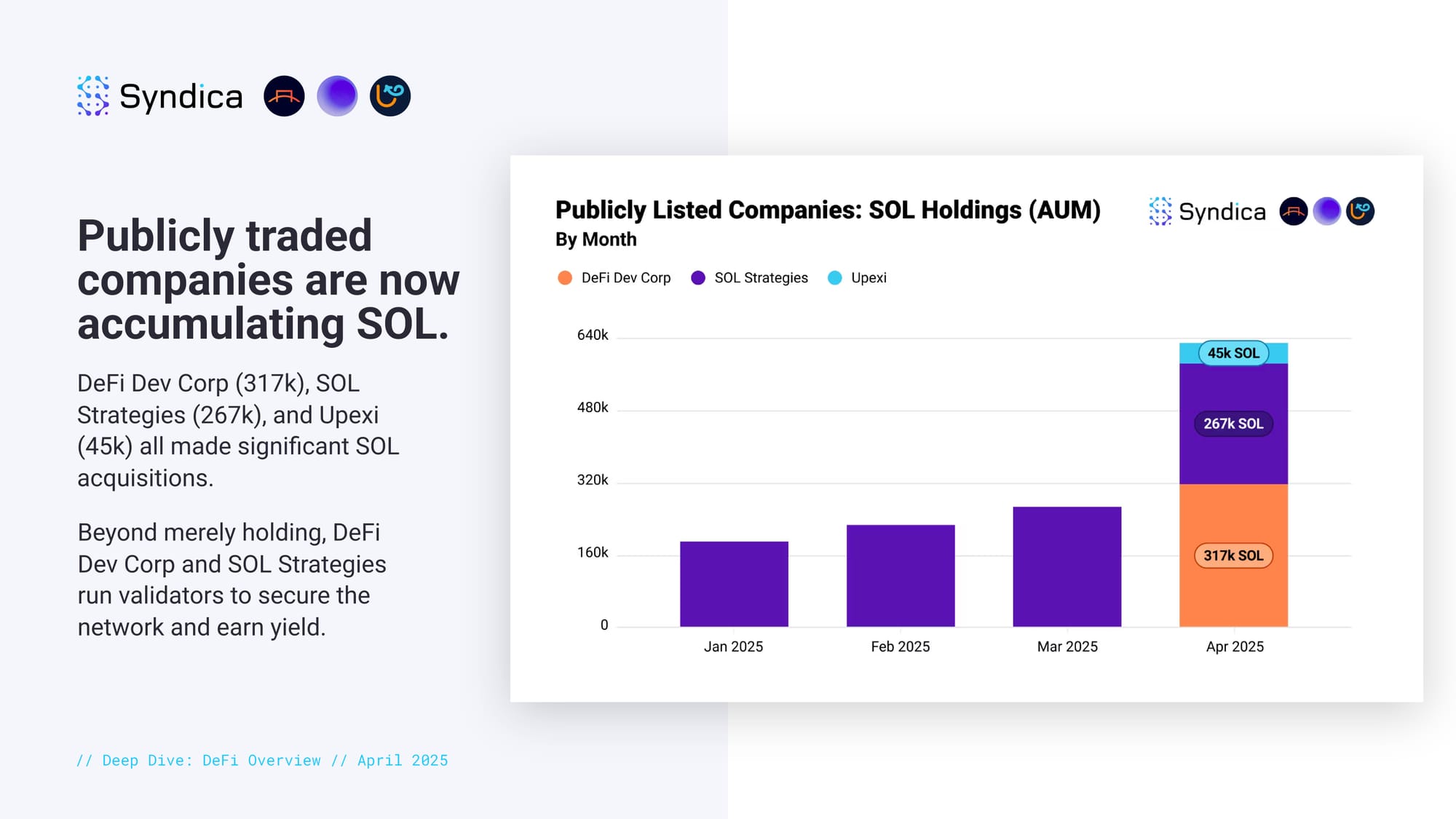 Publicly traded companies are now accumulating SOL. DeFi Dev Corp (317k), SOL Strategies (267k), and Upexi (45k) all made significant SOL acquisitions. Beyond merely holding, DeFi Dev Corp and SOL Strategies run validators to secure the network and earn yield.