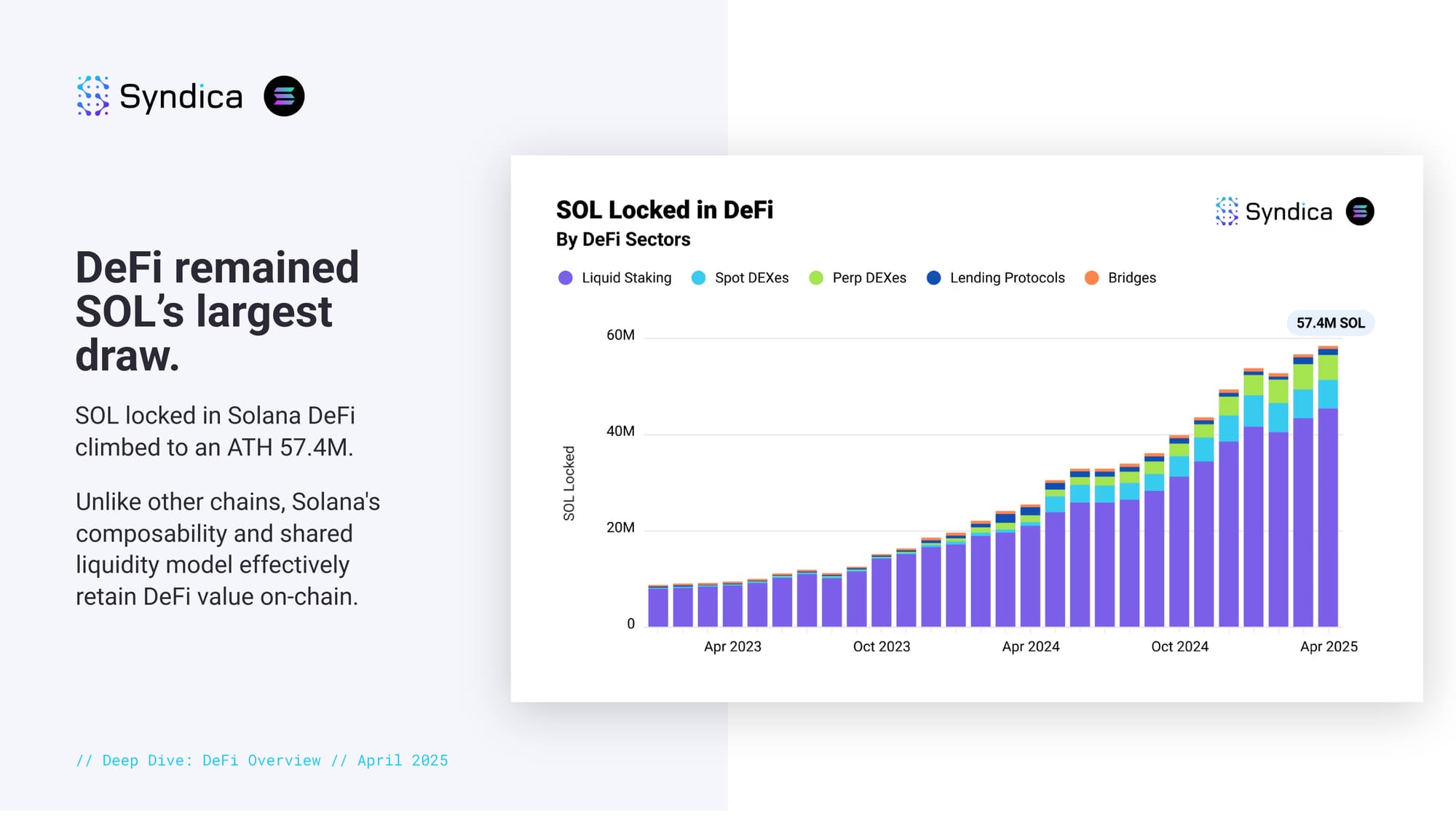 DeFi remained SOL’s largest draw. SOL locked in Solana DeFi climbed to an ATH 57.4M. Unlike other chains, Solana's composability and shared liquidity model effectively retain DeFi value on-chain.