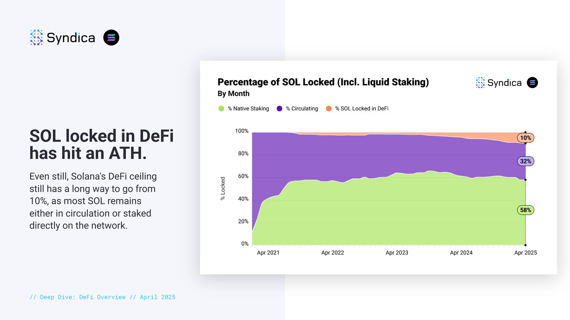 SOL locked in DeFi has hit an ATH. Even still, Solana's DeFi ceiling still has a long way to go from 10%, as most SOL remains either in circulation or staked directly on the network.