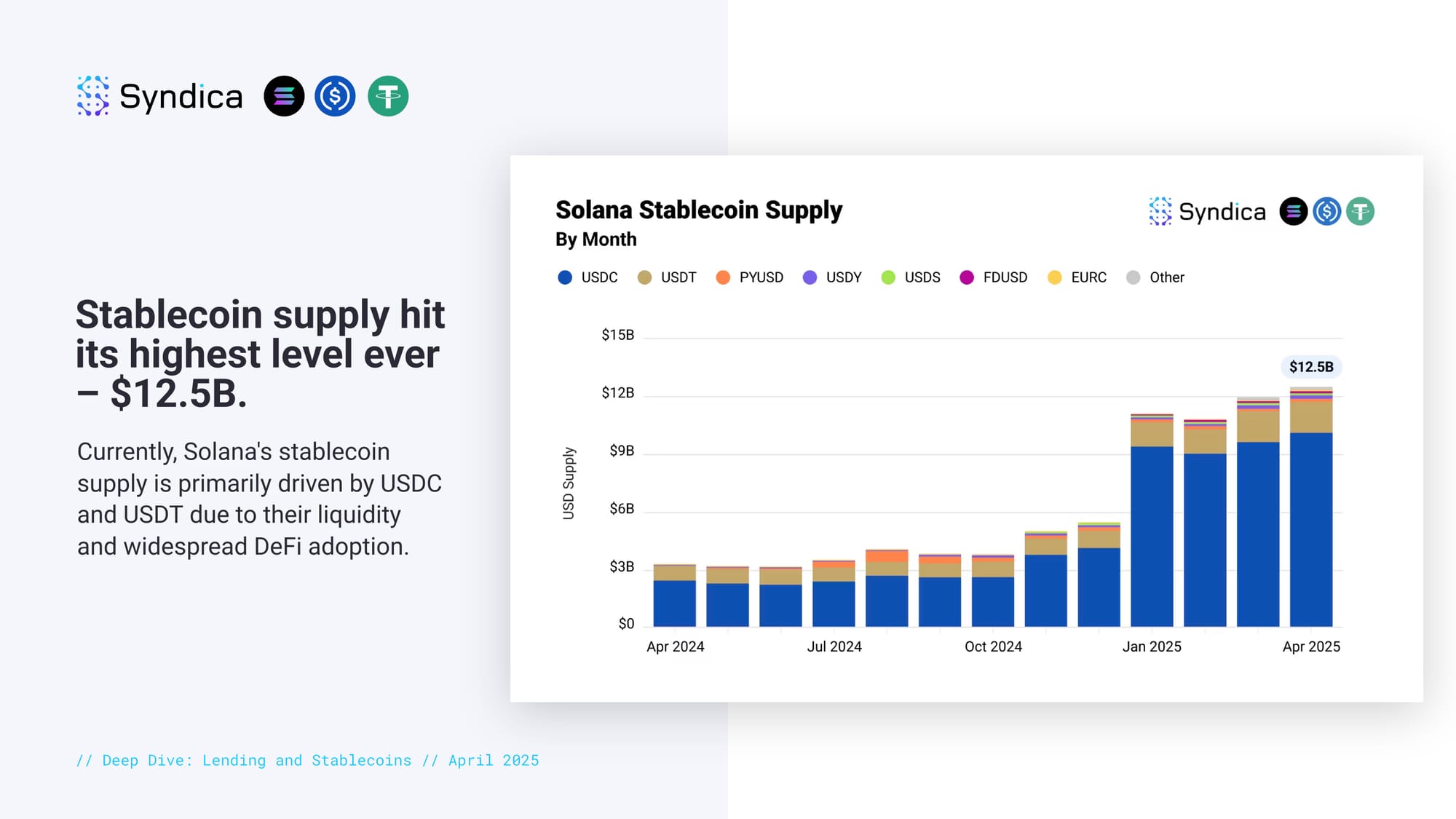 Stablecoin supply hit its highest level ever – $12.5B. Currently, Solana's stablecoin supply is primarily driven by USDC and USDT due to their liquidity and widespread DeFi adoption.