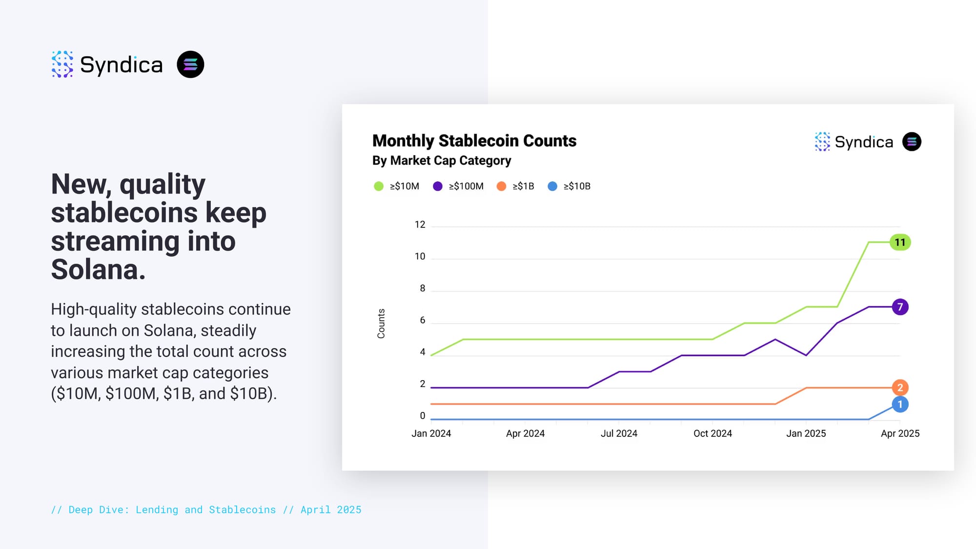 New, quality stablecoins keep streaming into Solana. High-quality stablecoins continue to launch on Solana, steadily increasing the total count across various market cap categories ($10M, $100M, $1B, and $10B).