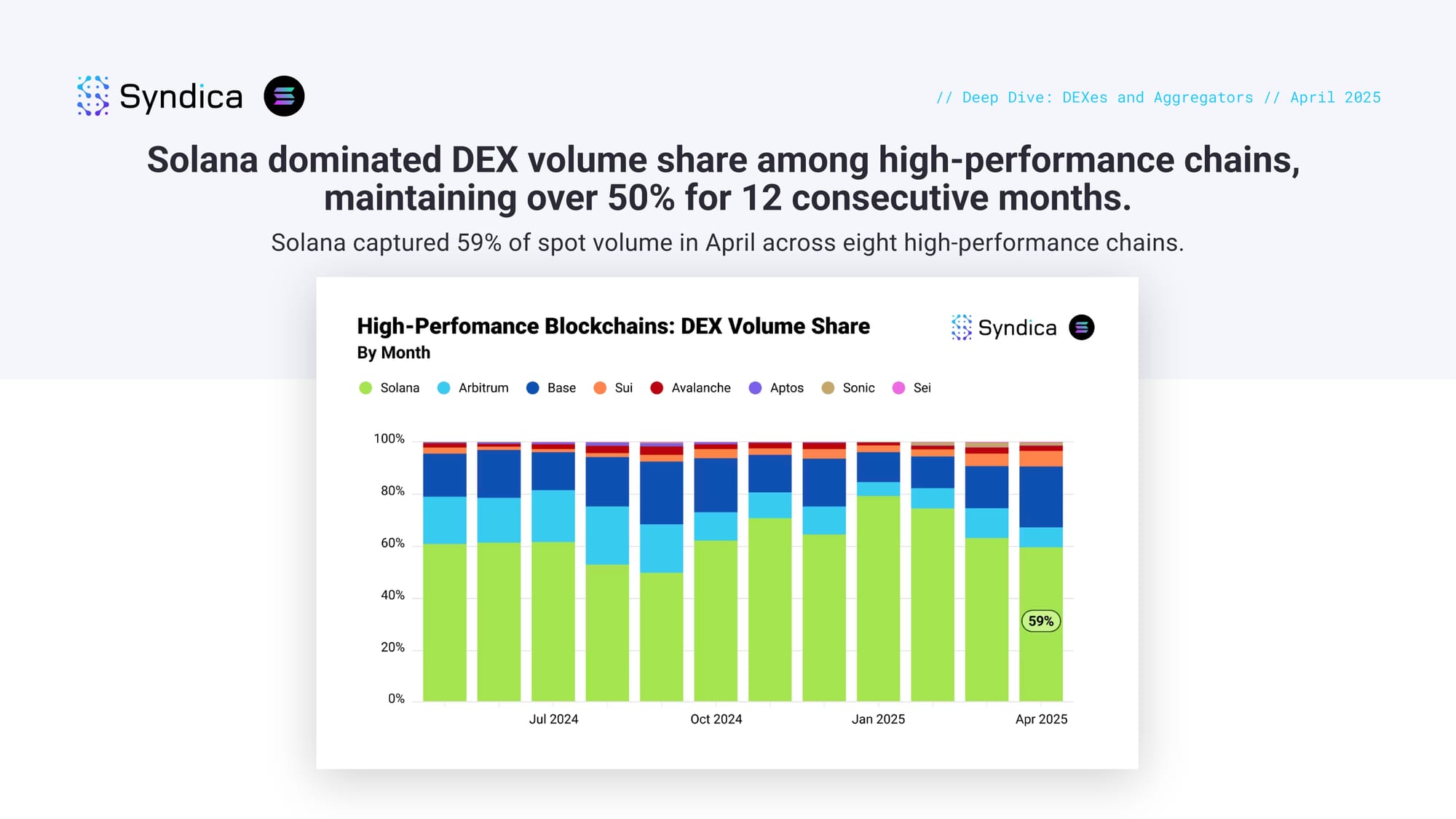 Solana dominated DEX volume share among high-performance chains, maintaining over 50% for 12 consecutive months. Solana captured 59% of spot volume in April across eight high-performance chains.