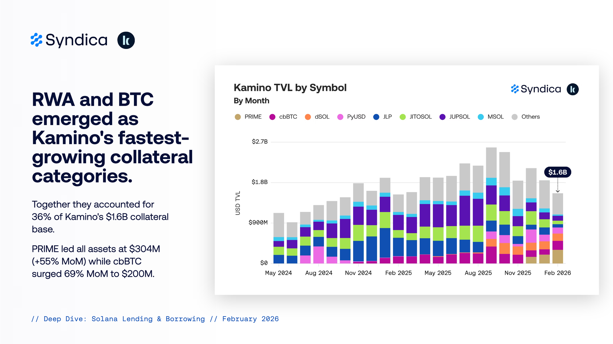 Together they accounted for 36% of Kamino's $1.6B collateral base. PRIME led all assets at $304M (+55% MoM) while cbBTC surged 69% MoM to $200M.
