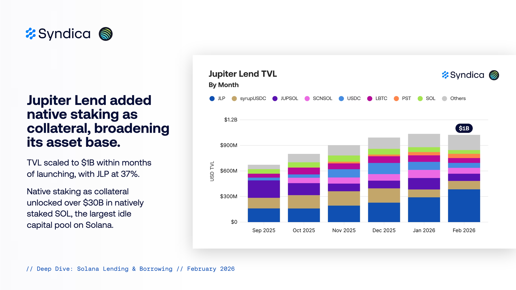 TVL scaled to $1B within months of launching, with JLP at 37%. Native staking as collateral unlocked over $30B in natively staked SOL, the largest idle capital pool on Solana.