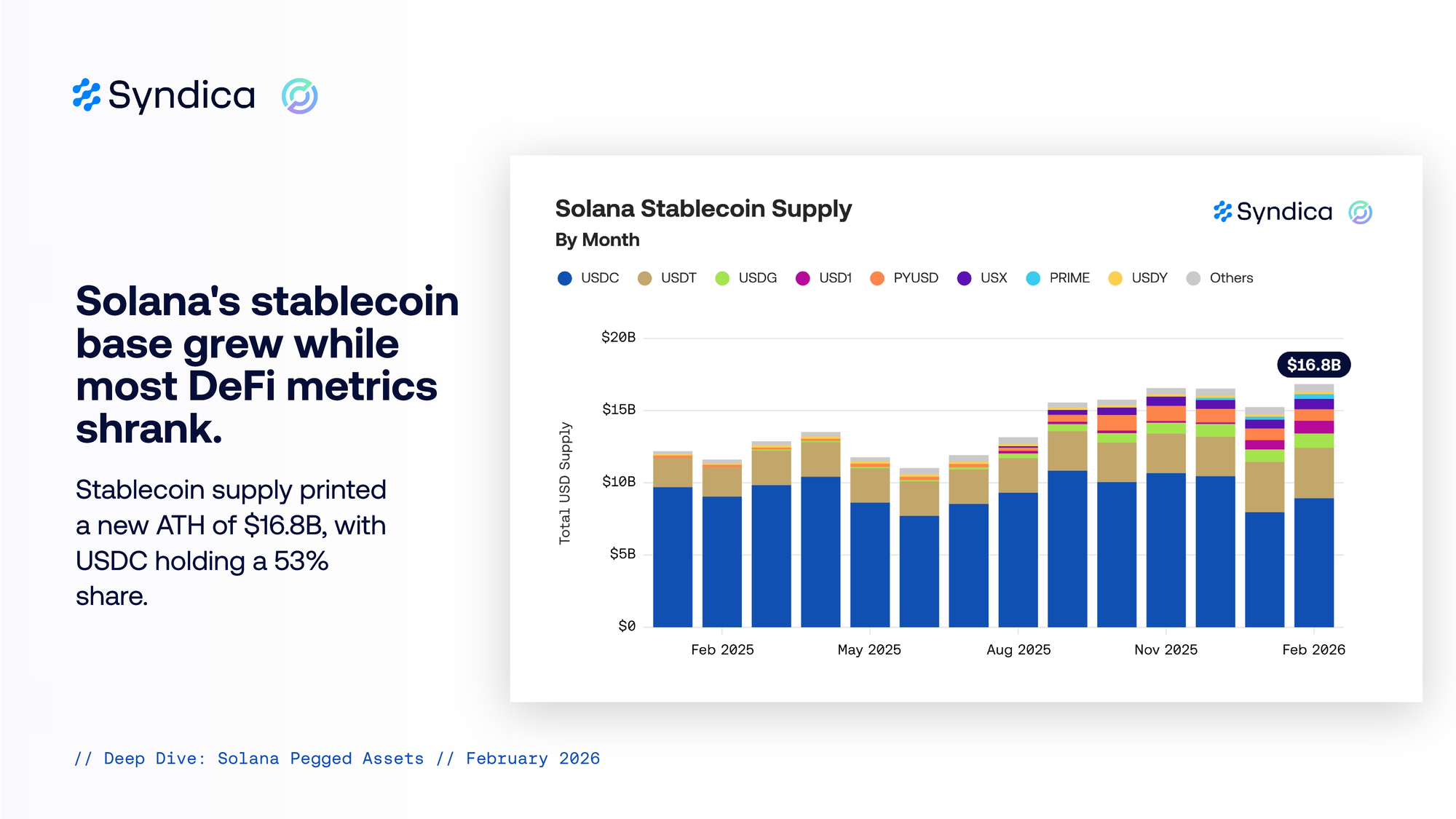 Stablecoin supply printed a new ATH of $16.8B, with USDC holding a 53% share.