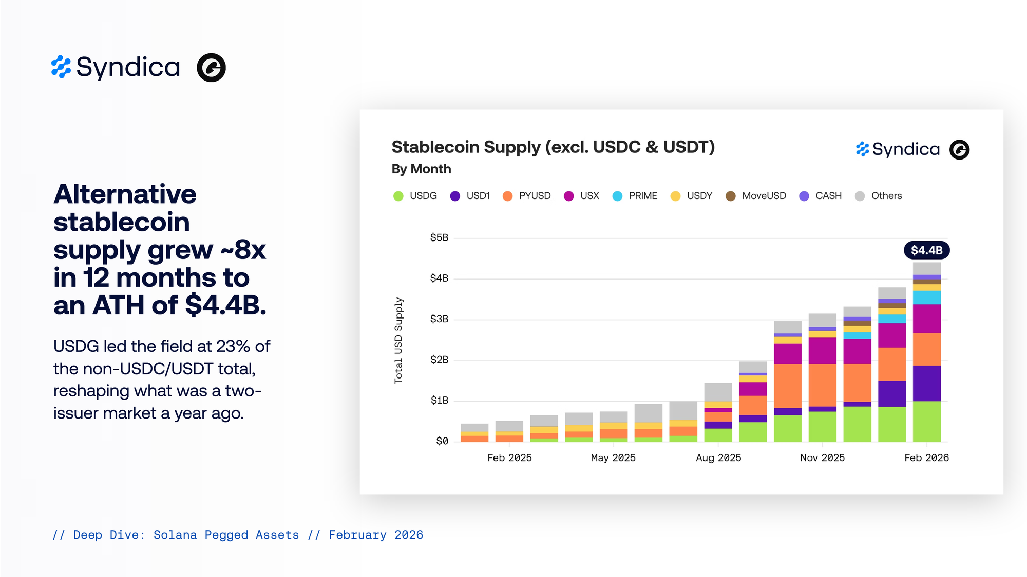 USDG led the field at 23% of the non-USDC/USDT total, reshaping what was a two-issuer market a year ago.