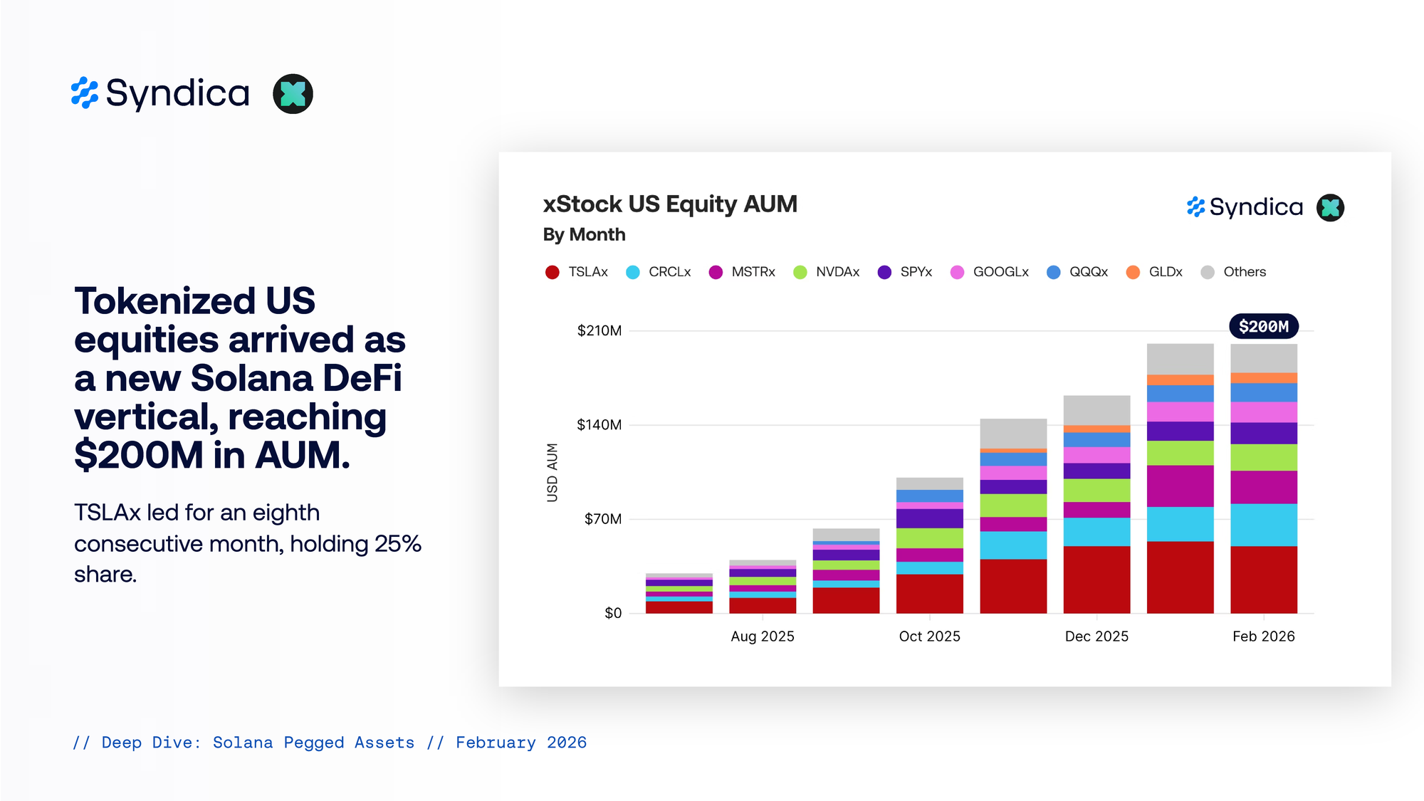 Tokenized US equities arrived as a new Solana DeFi vertical, reaching $200M in AUM.