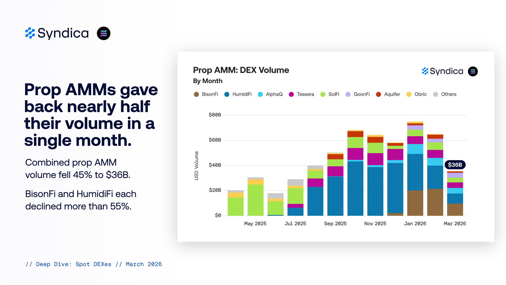 Combined prop AMM volume fell 45% to $36B. BisonFi and HumidiFi each declined more than 55%.