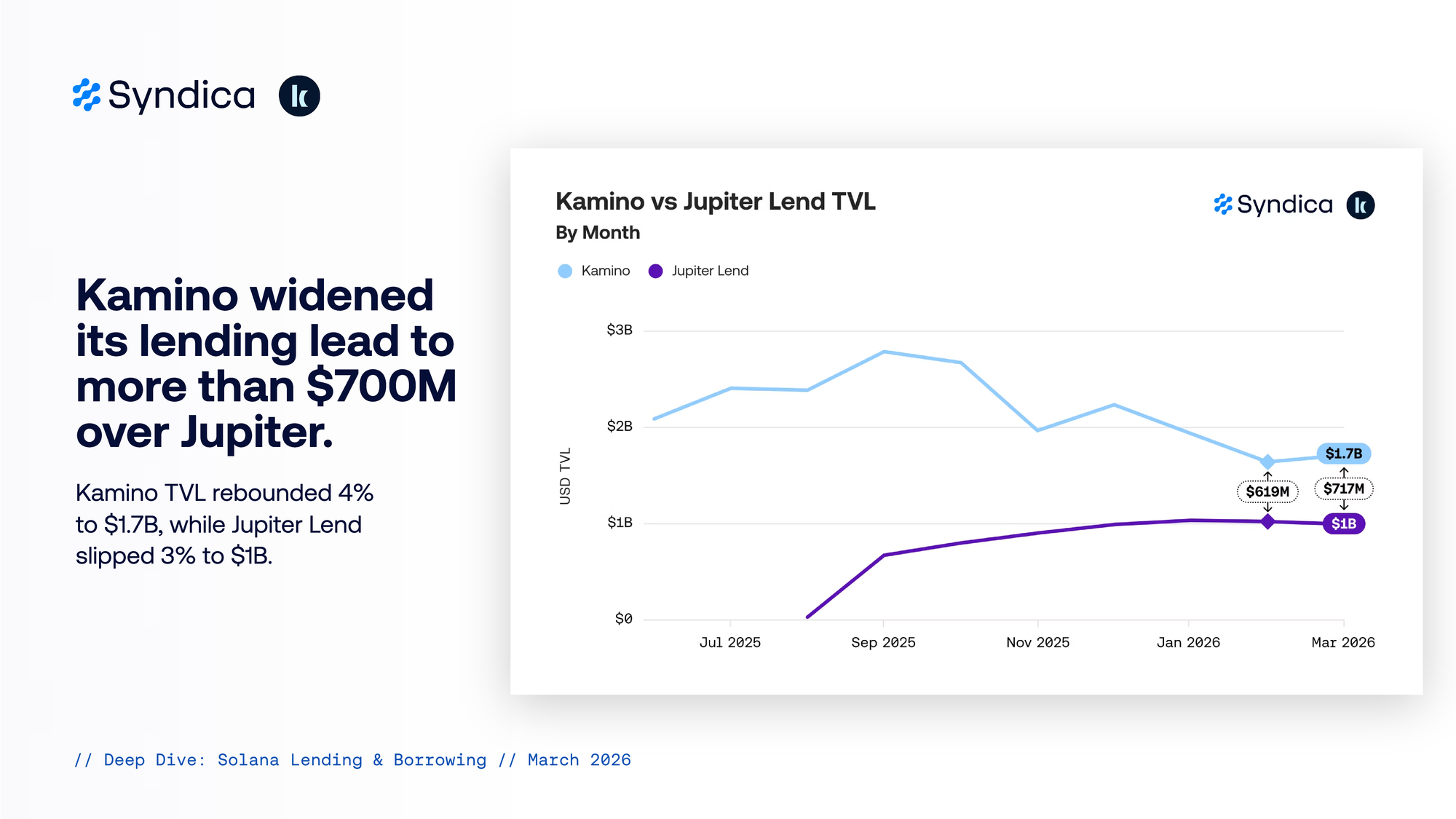 Kamino widened its lending lead to more than $700M over Jupiter.