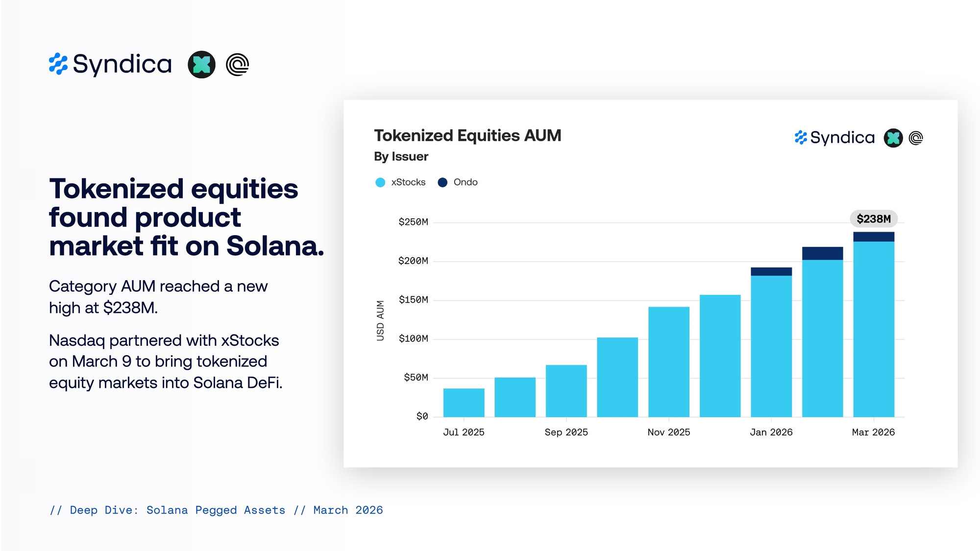 Category AUM reached a new high at $238M. Nasdaq partnered with xStocks on March 9 to bring tokenized equity markets into Solana DeFi.