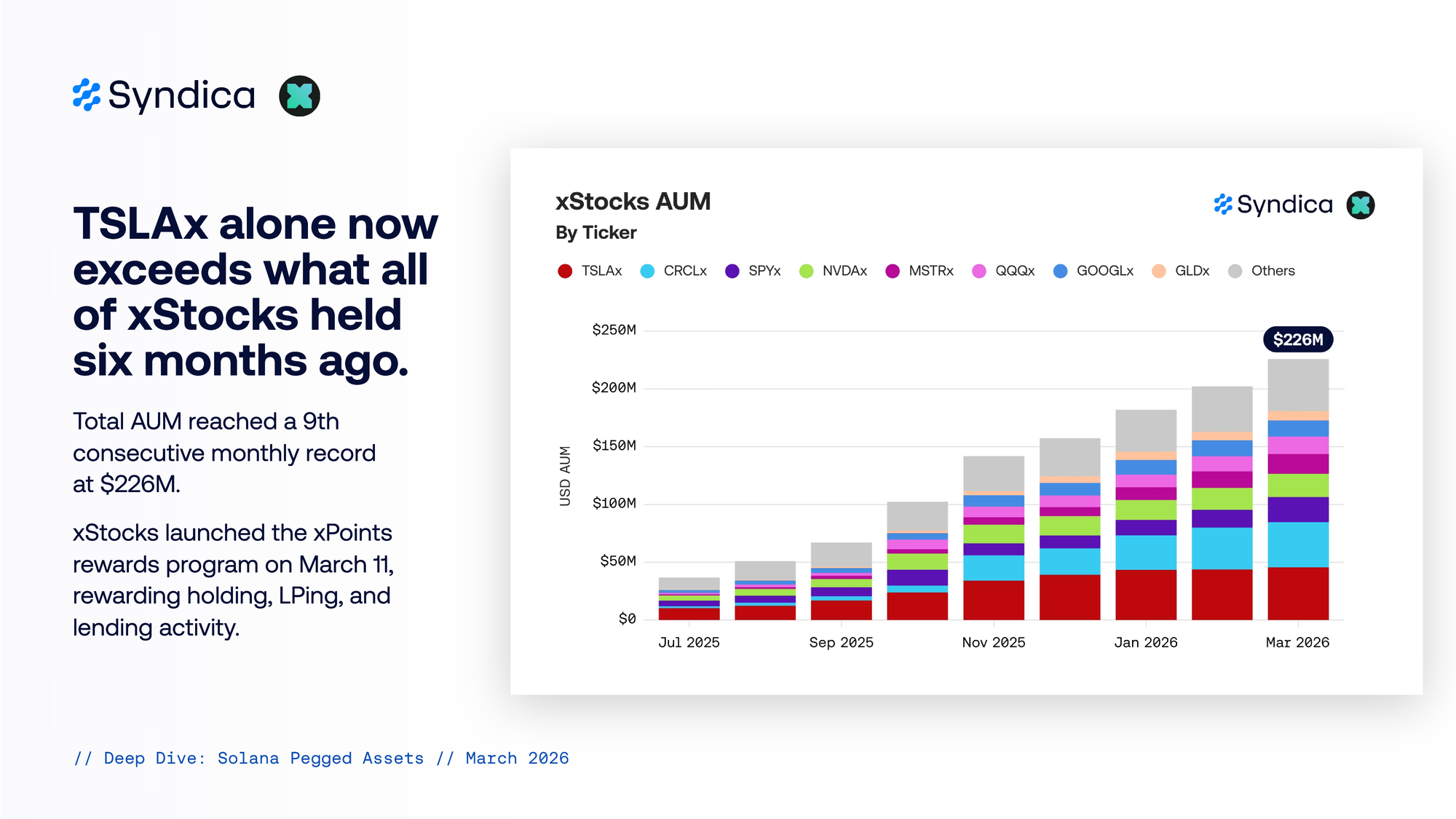 Total AUM reached a 9th consecutive monthly record at $226M. xStocks launched the xPoints rewards program on March 11, rewarding holding, LPing, and lending activity.