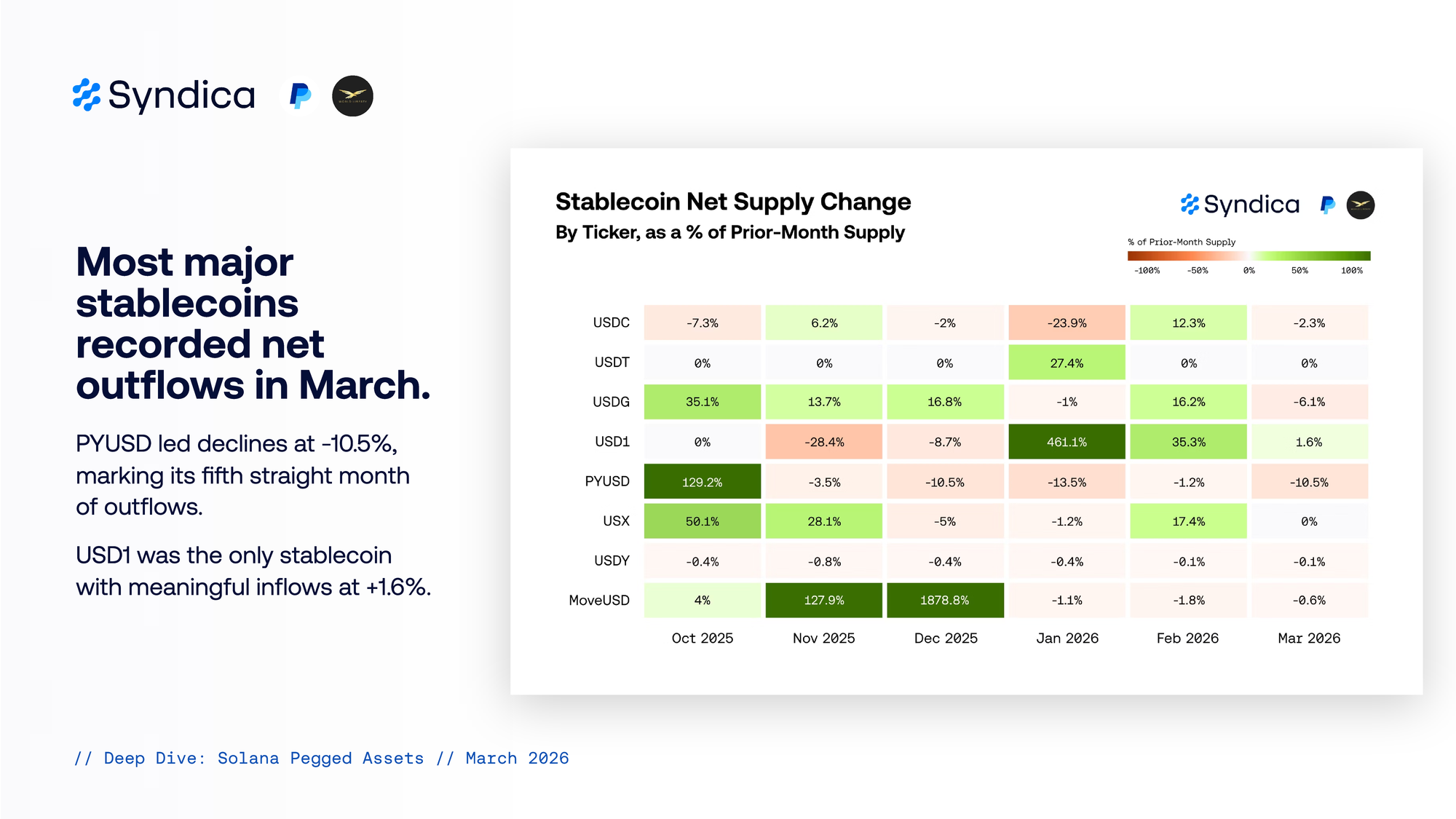PYUSD led declines at -10.5%, marking its fifth straight month of outflows. USD1 was the only stablecoin with meaningful inflows at +1.6%.