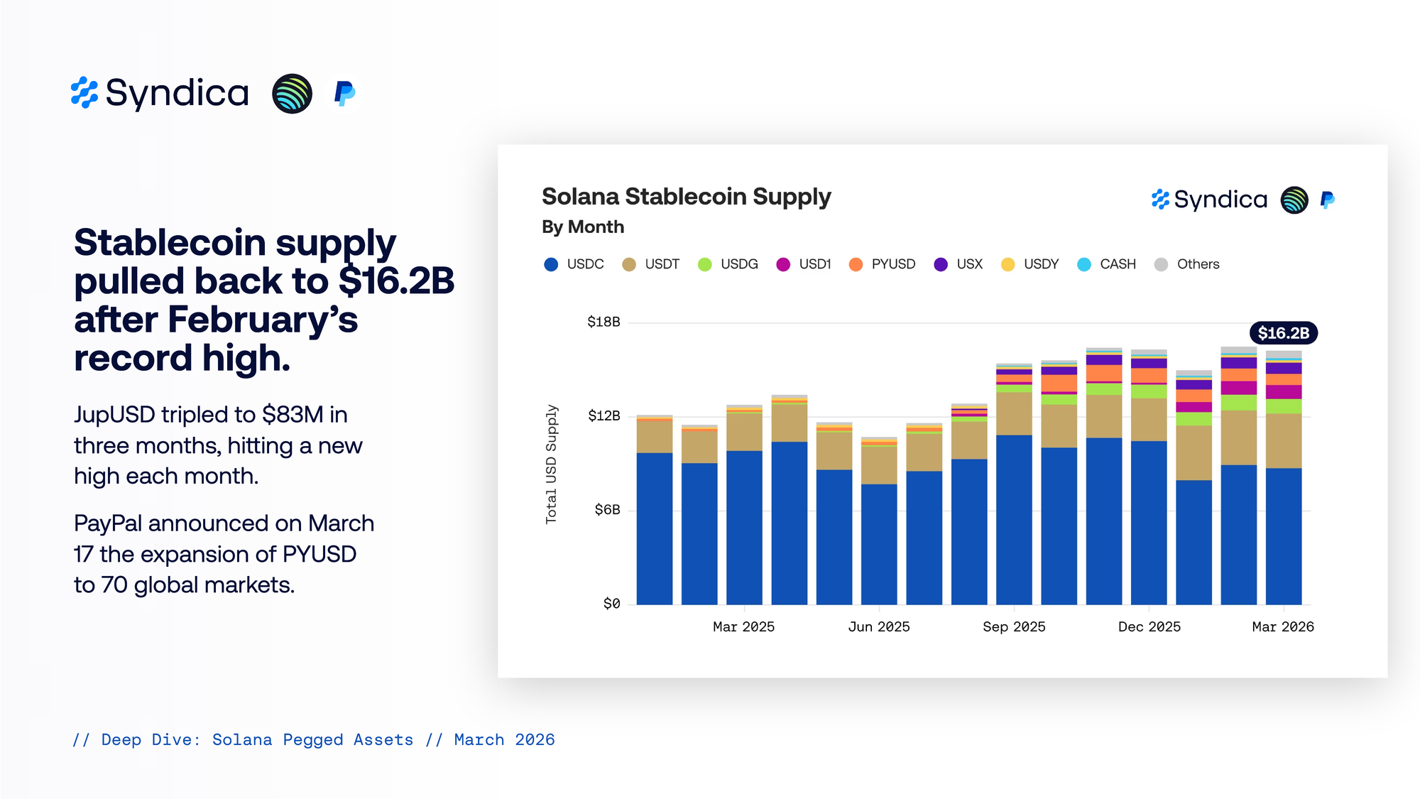 JupUSD tripled to $83M in three months, hitting a new high each month. PayPal announced on March 17 the expansion of PYUSD to 70 global markets.