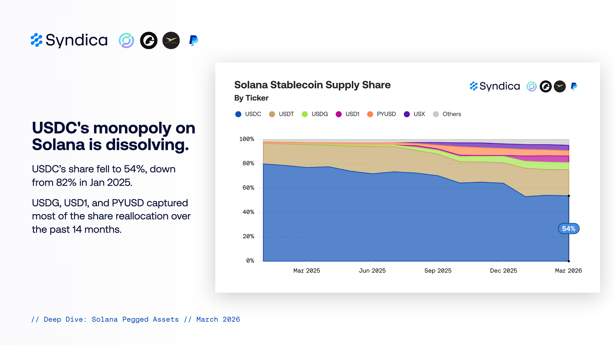 USDC’s share fell to 54%, down from 82% in Jan 2025. USDG, USD1, and PYUSD captured most of the share reallocation over the past 14 months.